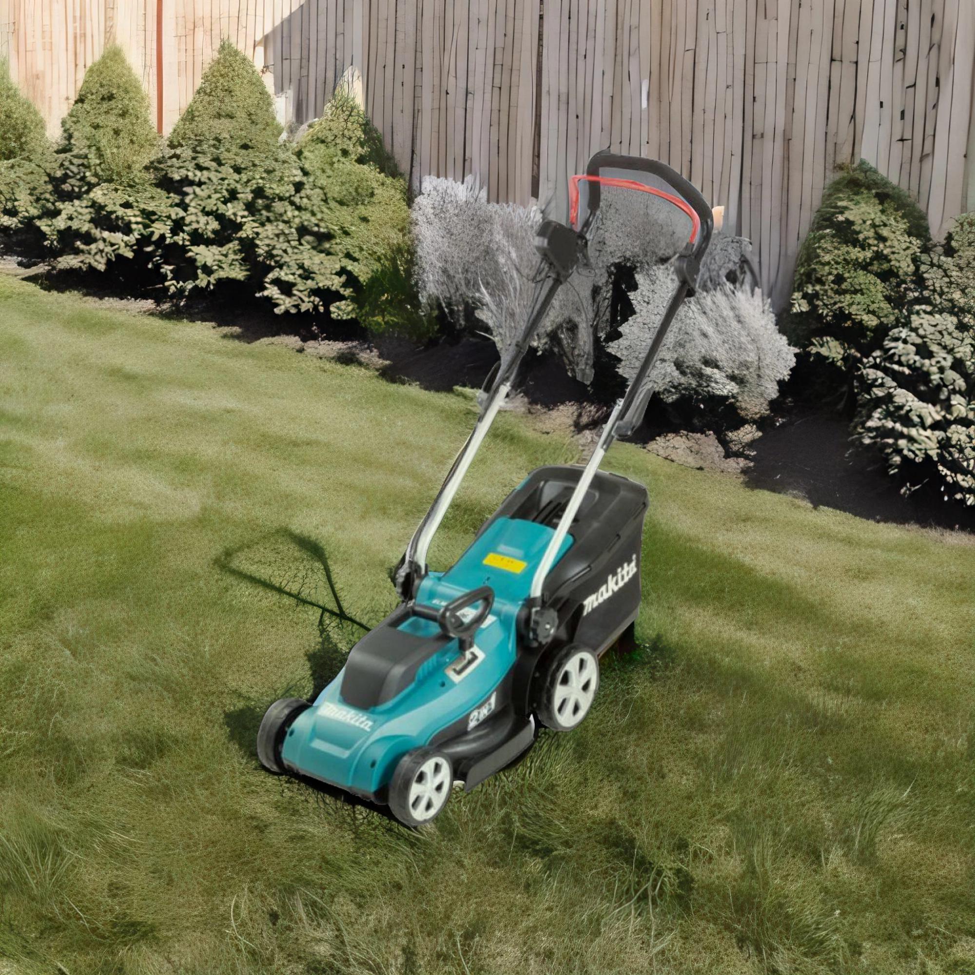боковые направляющие для травы, низкий уровень шума, ширина скоса за один проход 33 см, есть держатель кабеля, прочная пластиковая дека, индикатор заполненности травосборника, на корпусе предусмотрена рукоятка для транспортировки косилки