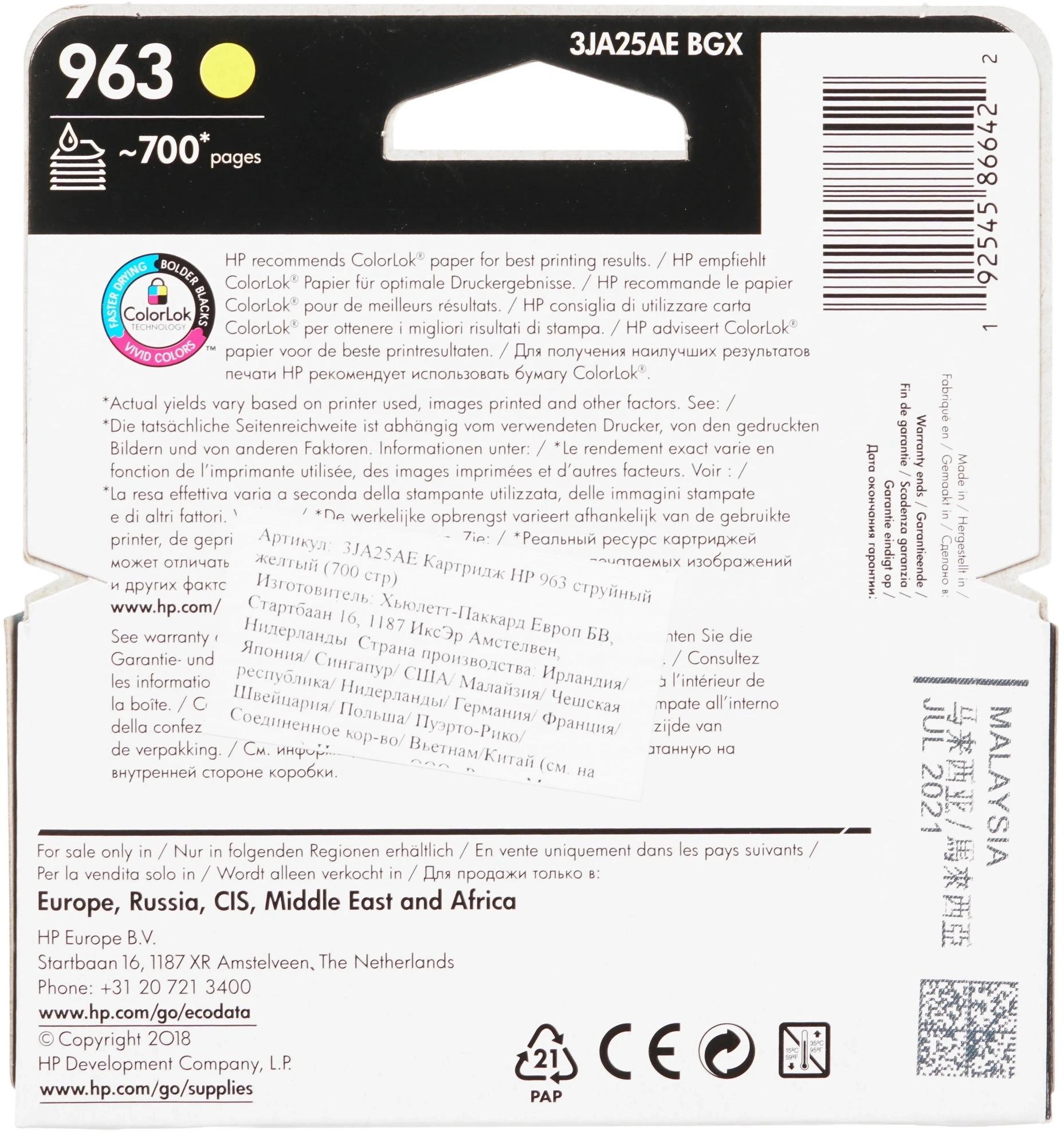 Картридж струйный HP 963 3JA25AE желтый (700стр.) для HP OfficeJet Pro 901x/902x HP