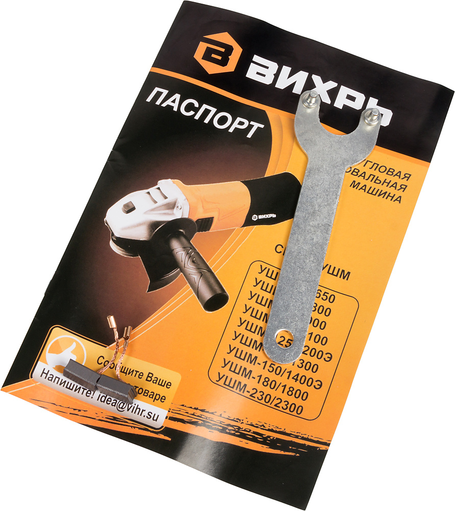 Угловая шлифовальная машина; Боковая рукоятка; Защитный кожух; Ключ фланцевый; Комплект угольных щеток