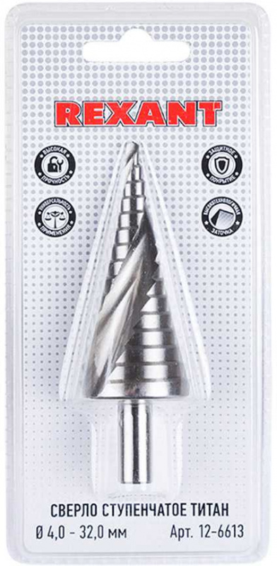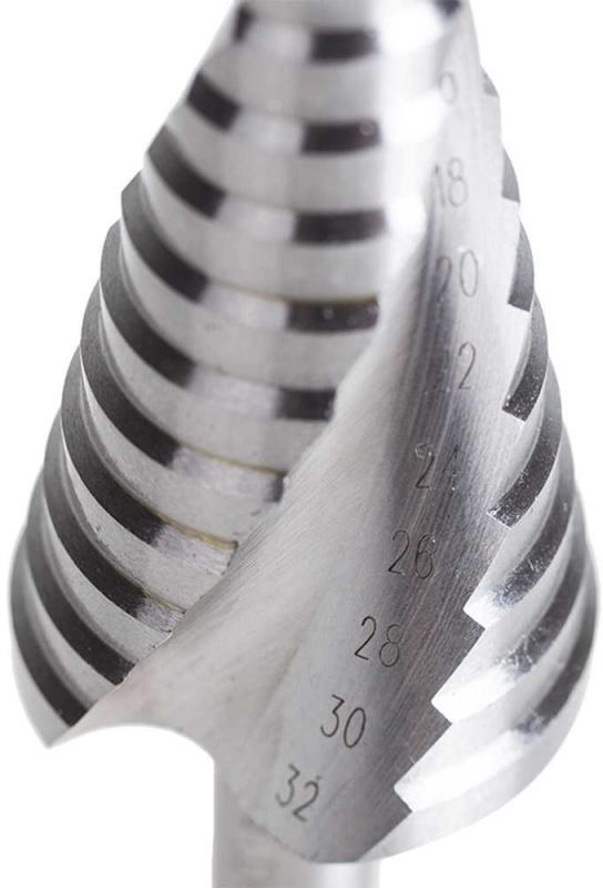 Ступенчатое сверло предназначено для получения отверстий различного диаметра без перестановки режущего инструмента. Хвостовик прибора имеет форму конуса. На ступенях есть маркировка фактического диаметра. Диапазон ступеней: 4, 6, 8, 10, 12, 14, 16, 18, 20, 22, 24, 26, 28, 30, 32мм