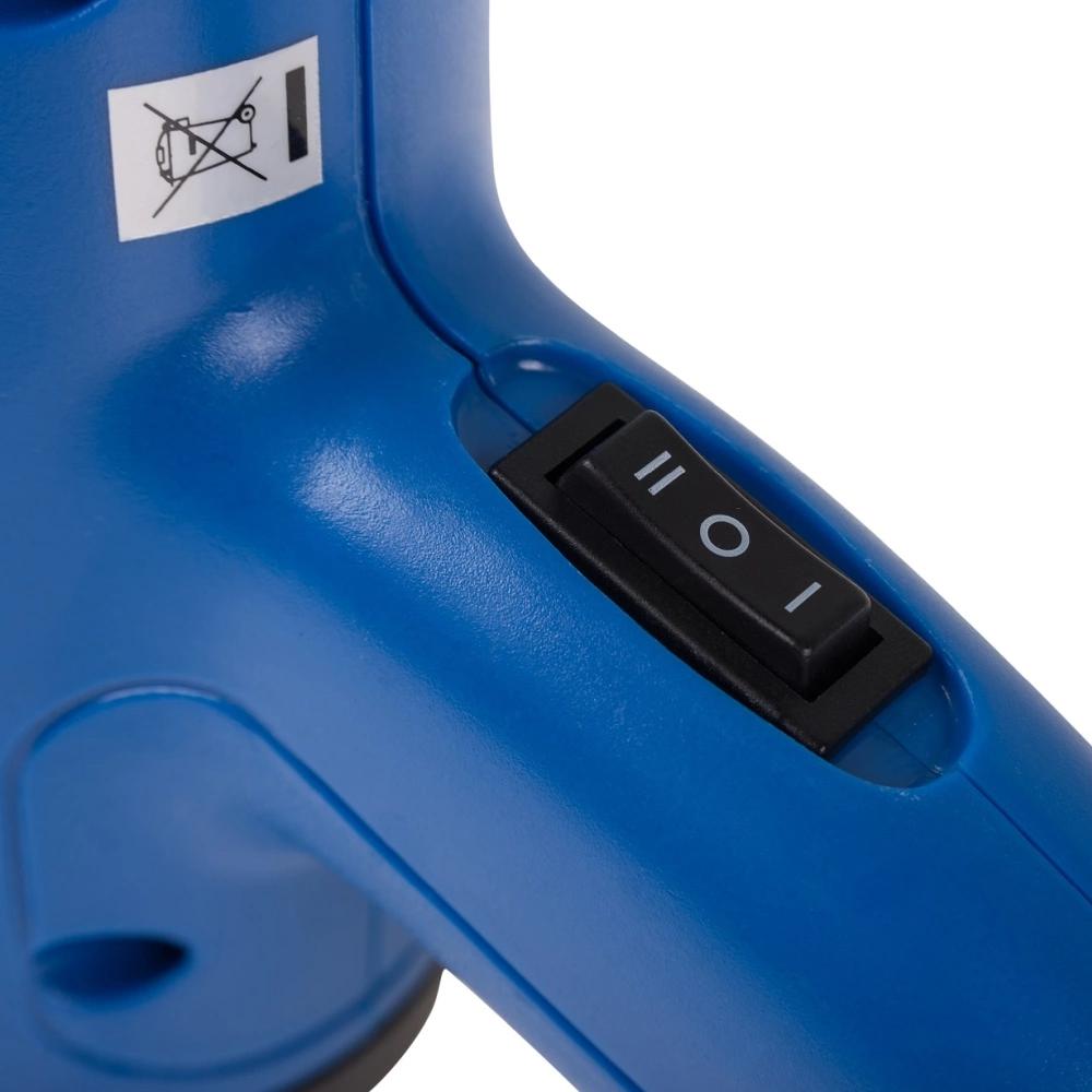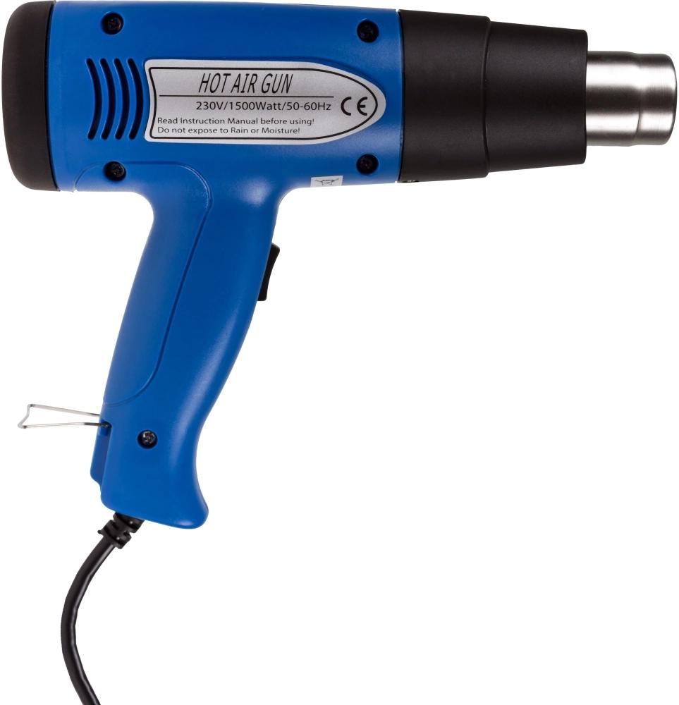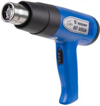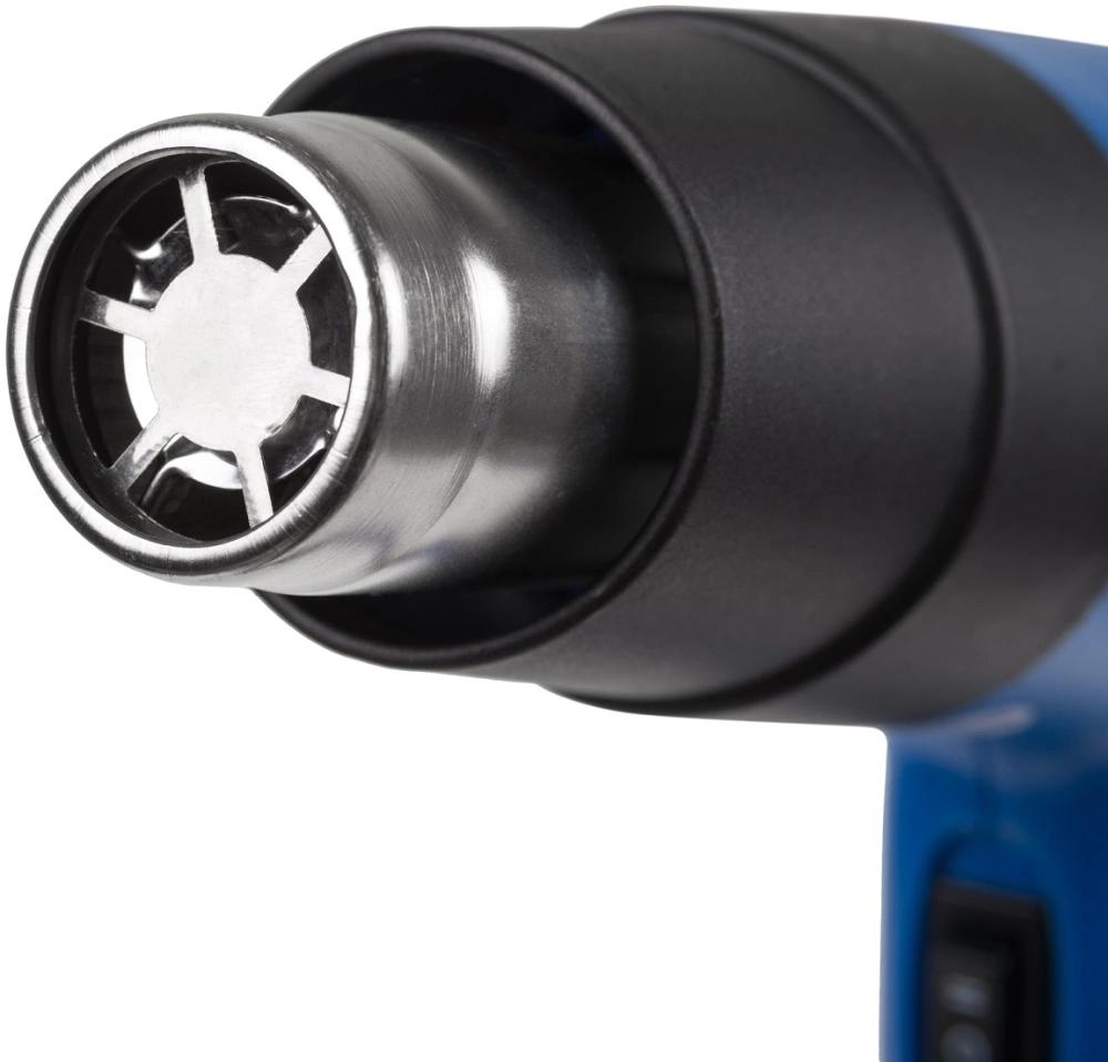 Корпус из нескользящего термостойкого пластика. Эргономичная рукоятка. Двухступенчатая регулировка температуры: I. температура воздуха - 180 °С, потребляемая мощность 750 Вт; II. температура воздуха - 500 °С, потребляемая мощность 1500 Вт; Редукционная насадка в комплекте