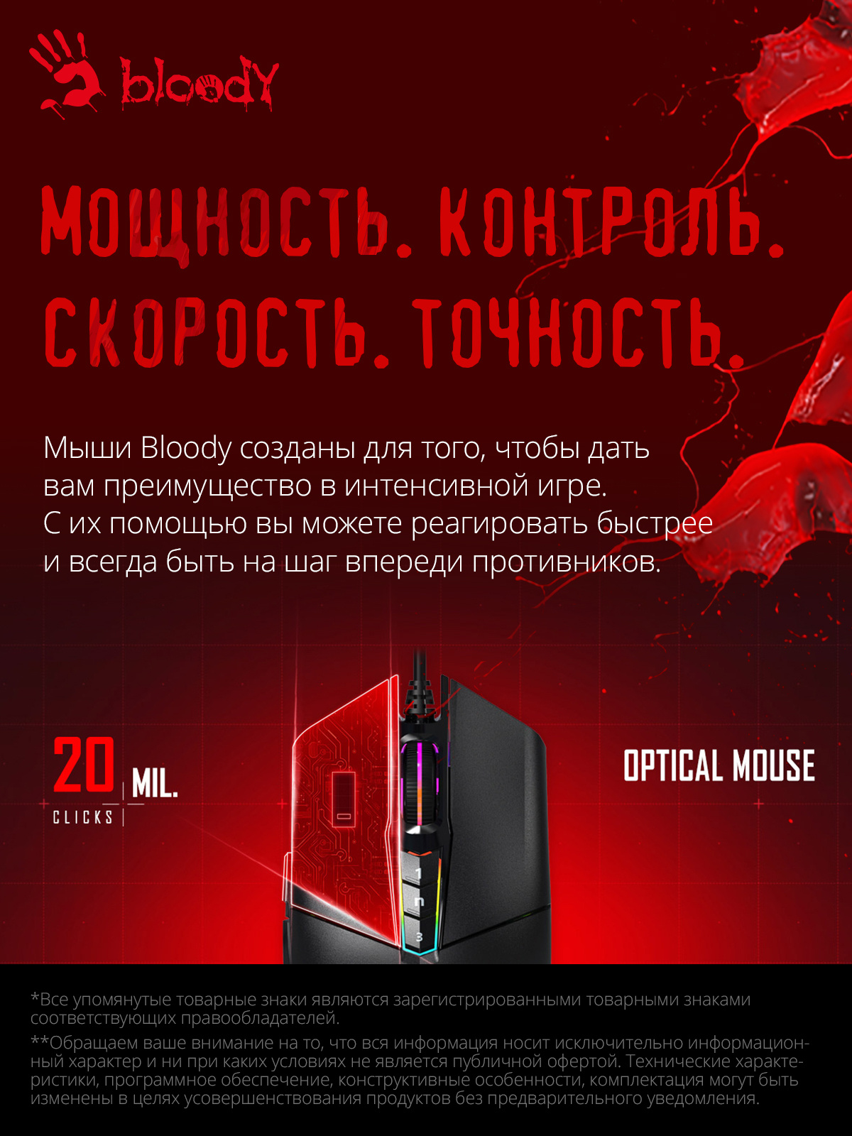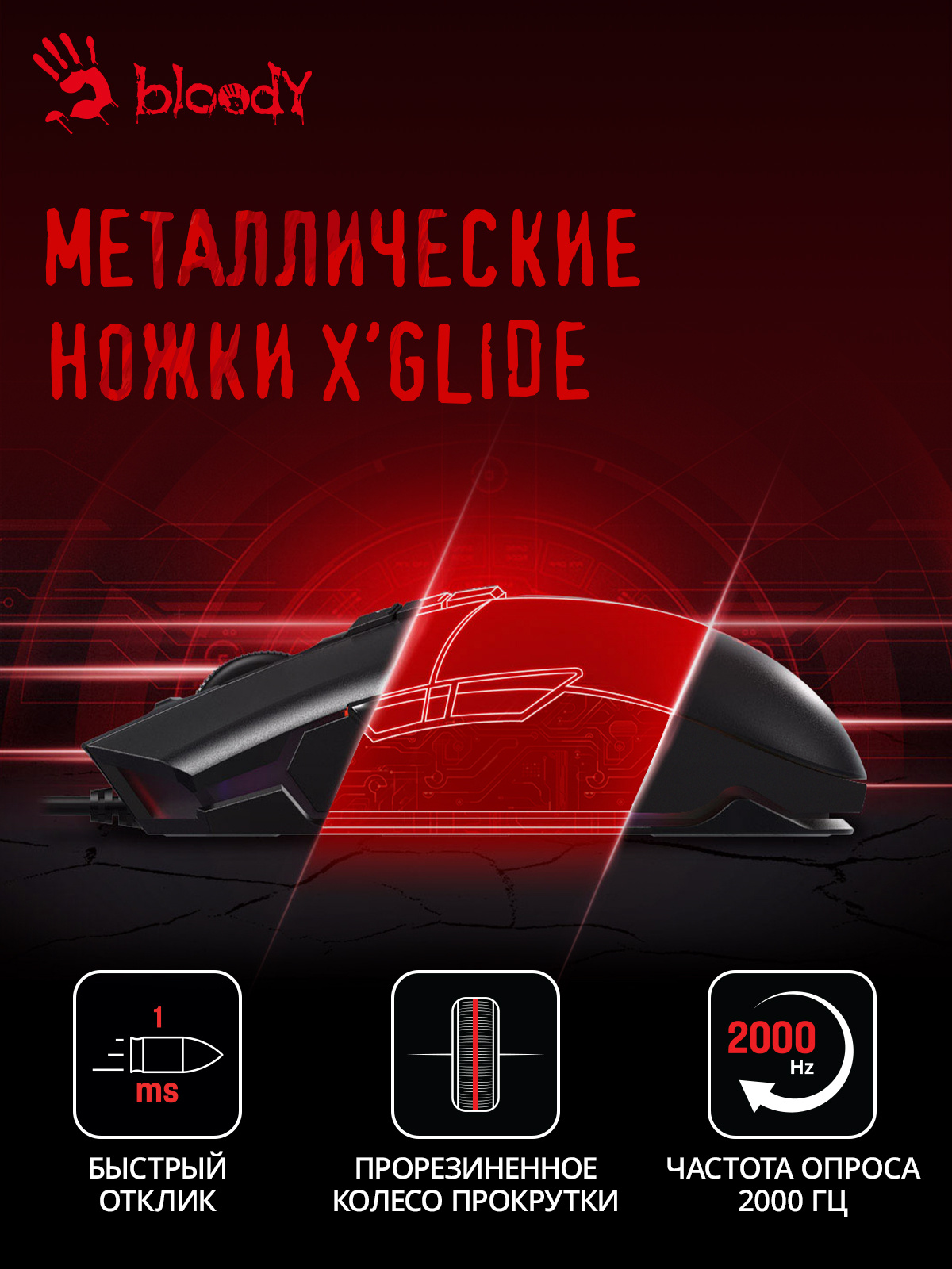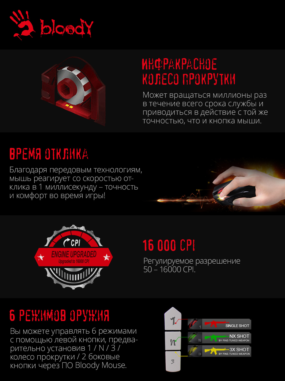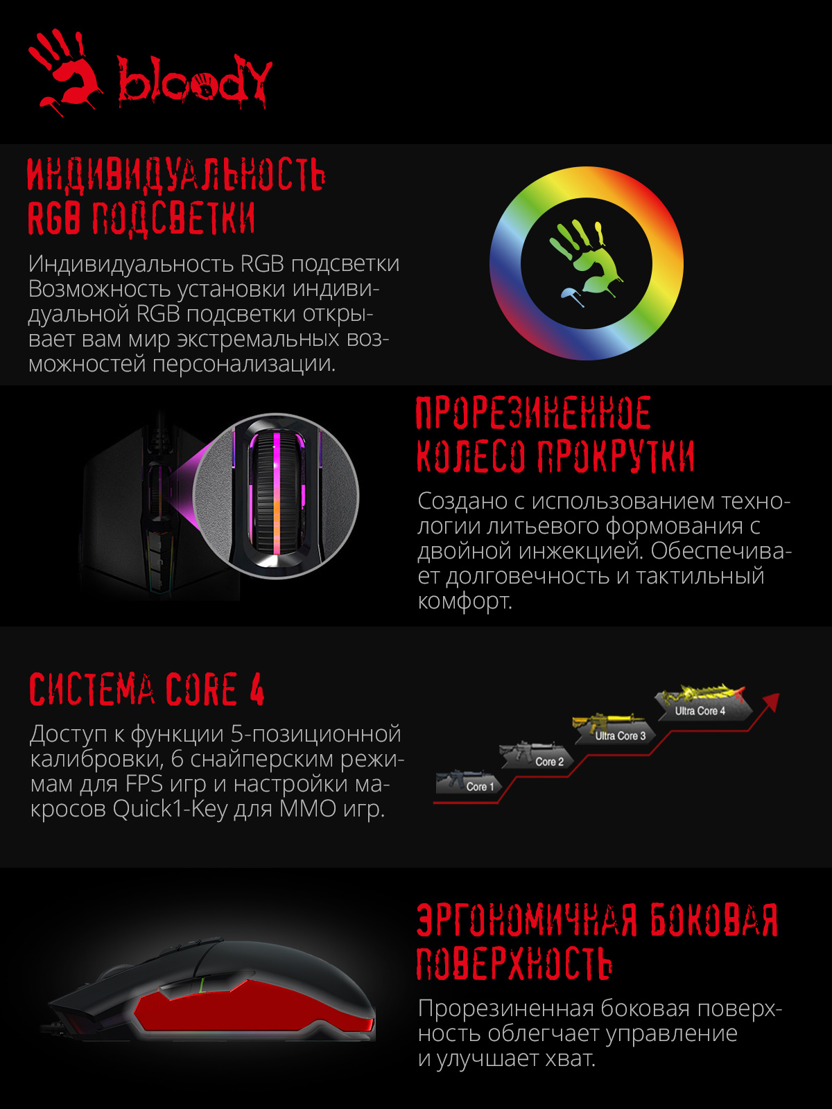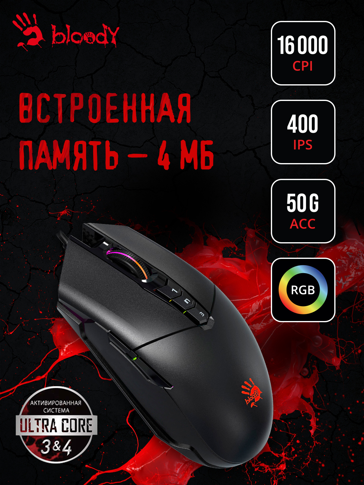 Sensor: PixArt PMW3389 Gaming Engine. 400 ips. RGB-подсветка. Прорезиненный инфракрасный скролл. Система 4 Core. Металлические ножки X'Glide. 6 режима стрельбы для левой кнопки. Время отклика 1 мс.при установке ПО Bloody7, уровни core3, 4 активированы бесплатно