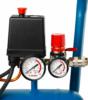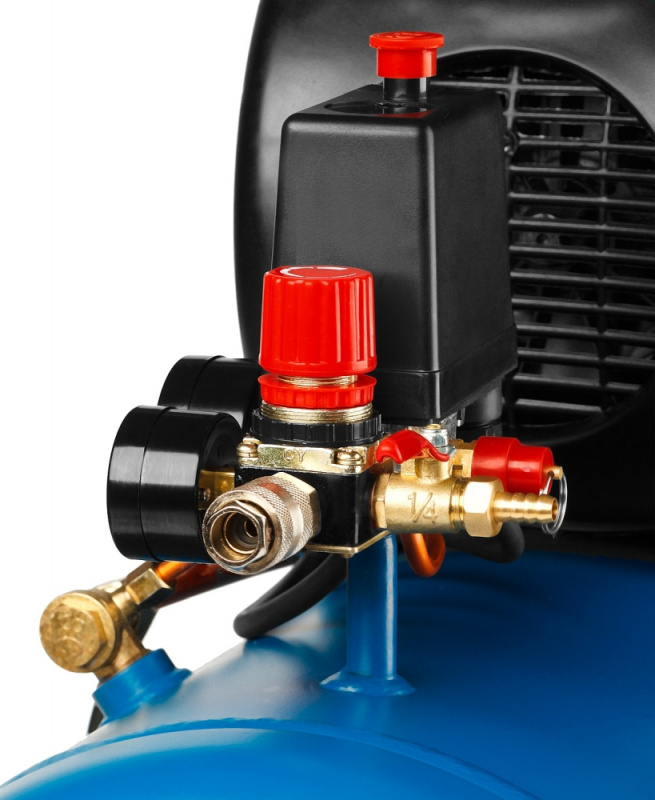 Механический клапан сброса давления. Шумозащитный пластиковый кожух. Эргономичная ручка и колеса для удобства транспортировки. Возможность подсоединения дополнительного ресивера или штуцера. Контроль давления в ресивере и на выходе при помощи двух манометров.