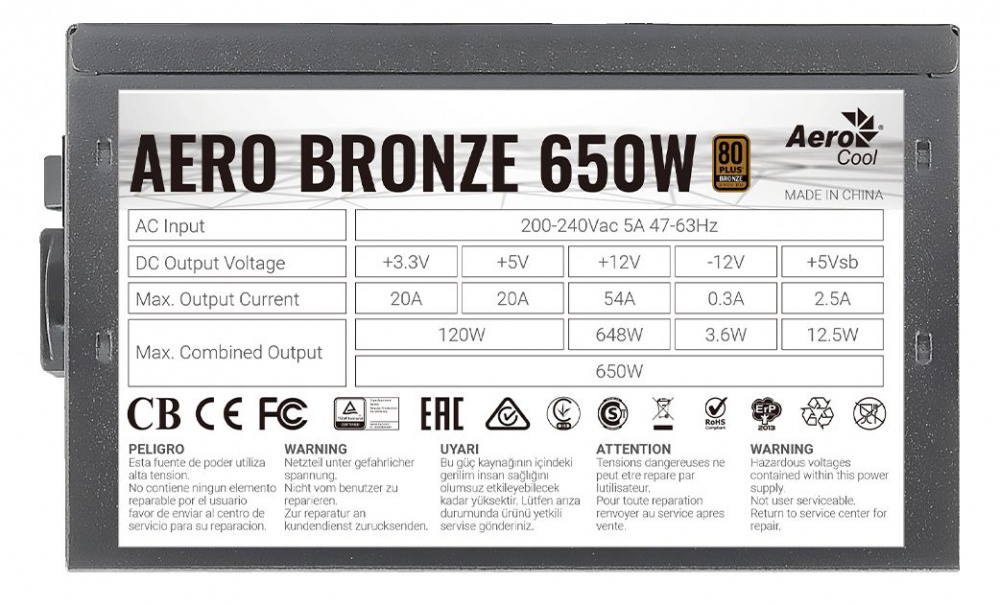 Блок питания Aerocool ATX 650W AERO BRONZE 80+ bronze (20+4pin) APFC 120mm fan 6xSATA RTL