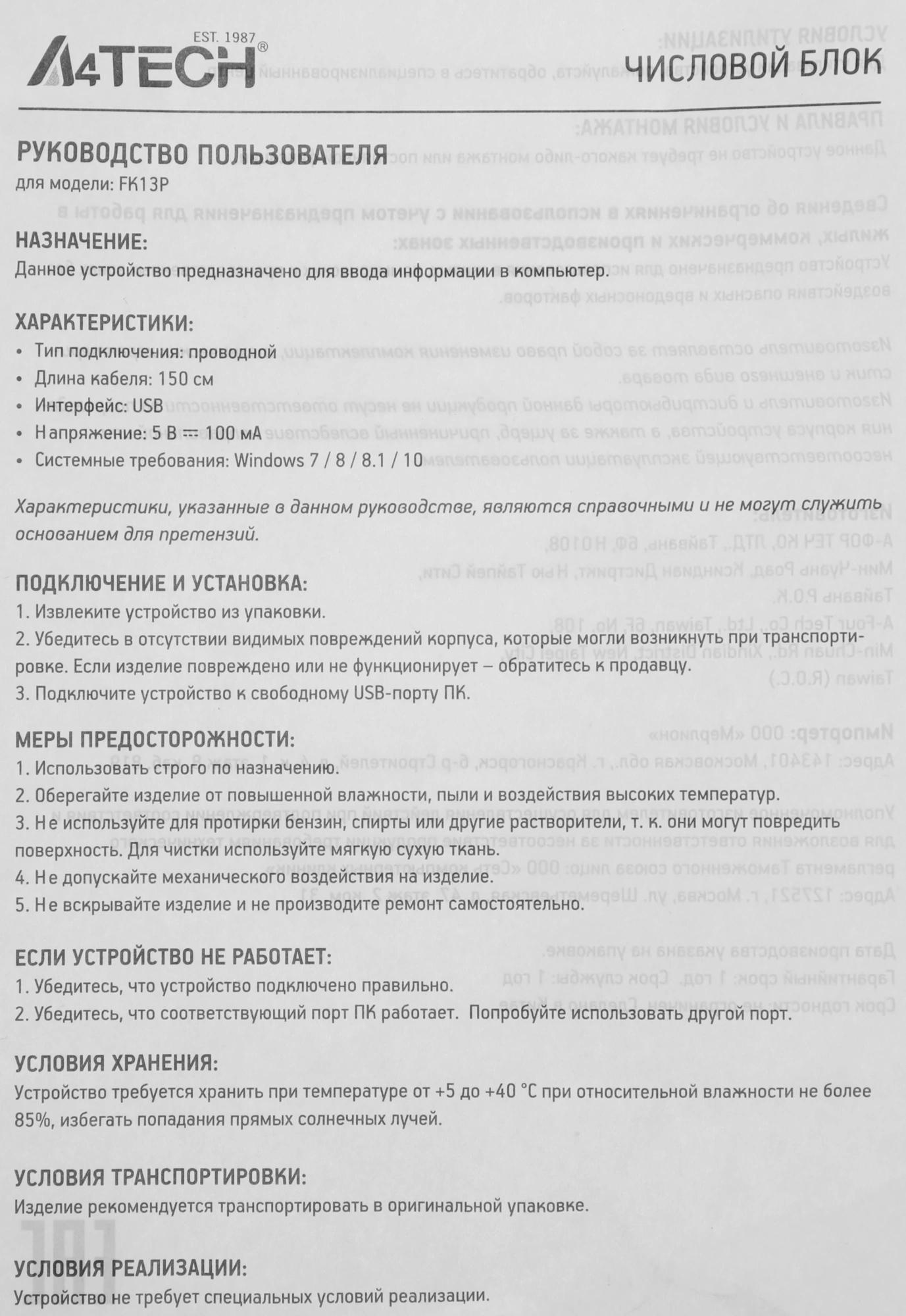 Числовой блок A4Tech Fstyler FK13P черный USB slim для ноутбука (FK13P BLACK)