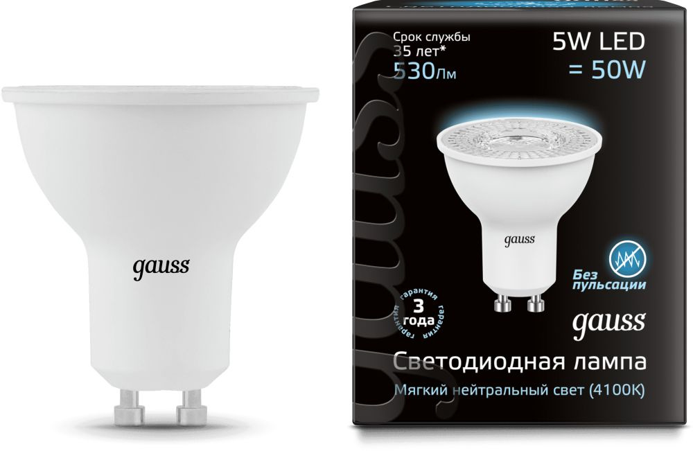 Светодиодная лампа Gauss - самый безопасный для здоровья и окружающей среды источник света. Она не пульсирует, мгновенно включается, не содержит ртути, и имеет больший срок службы, чем лампы накаливания и КЛЛ.