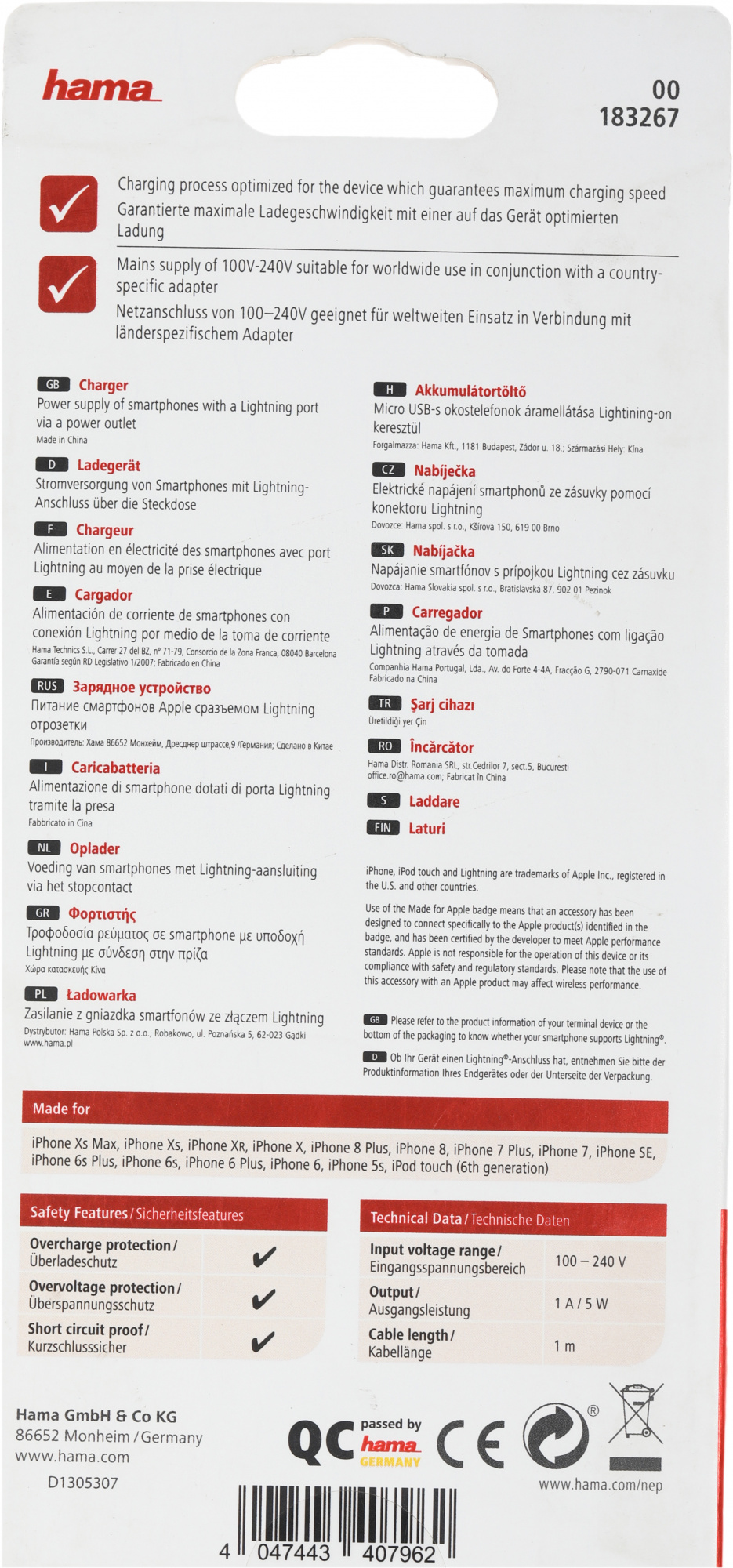 Сетевое зарядное устройство для мобильных телефонов Apple с разъемом Lightning . Максимальная выходная мощность - 5 Вт