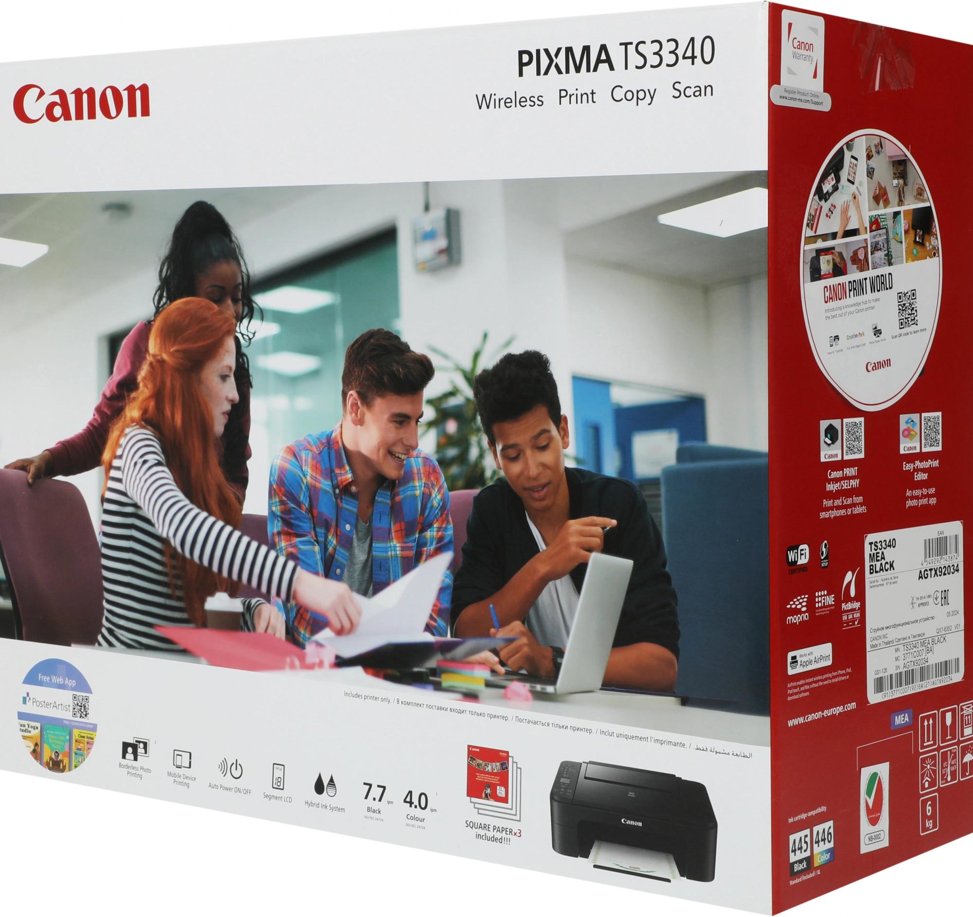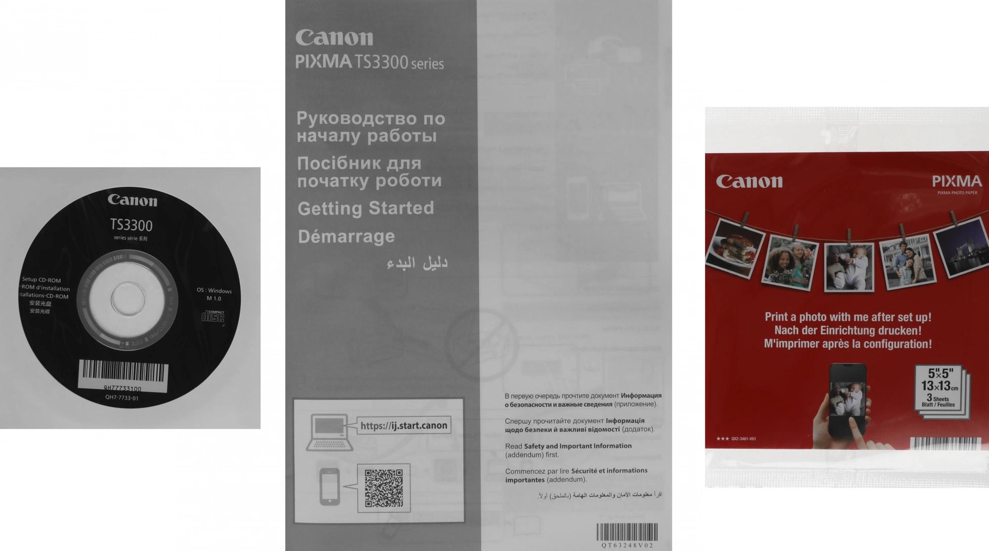 Принтер «Все в одном» — PIXMA TS3340.Картриджи FINE.Кабель питания.Установочный диск CD-ROM (CD только для ОС Windows).Руководства пользователя и другие документы