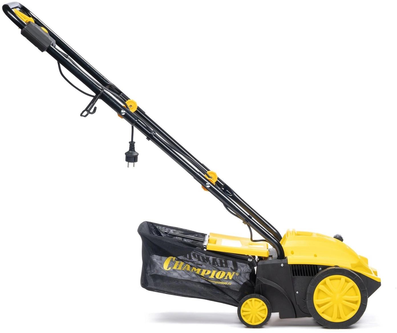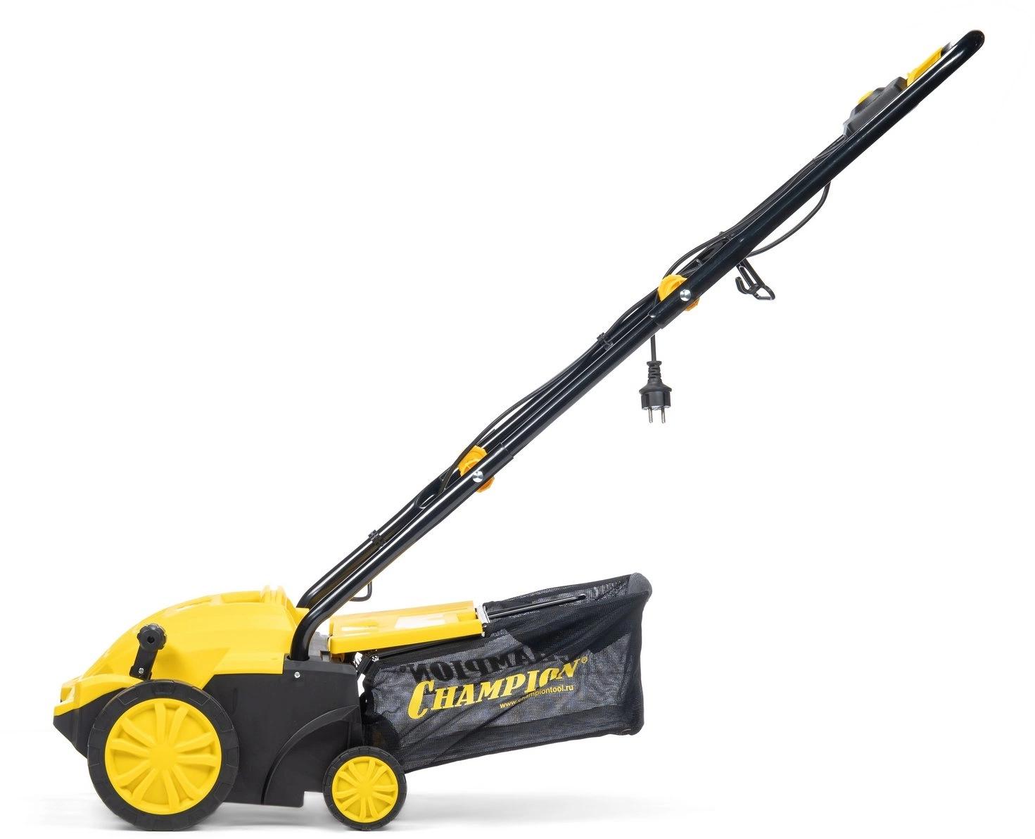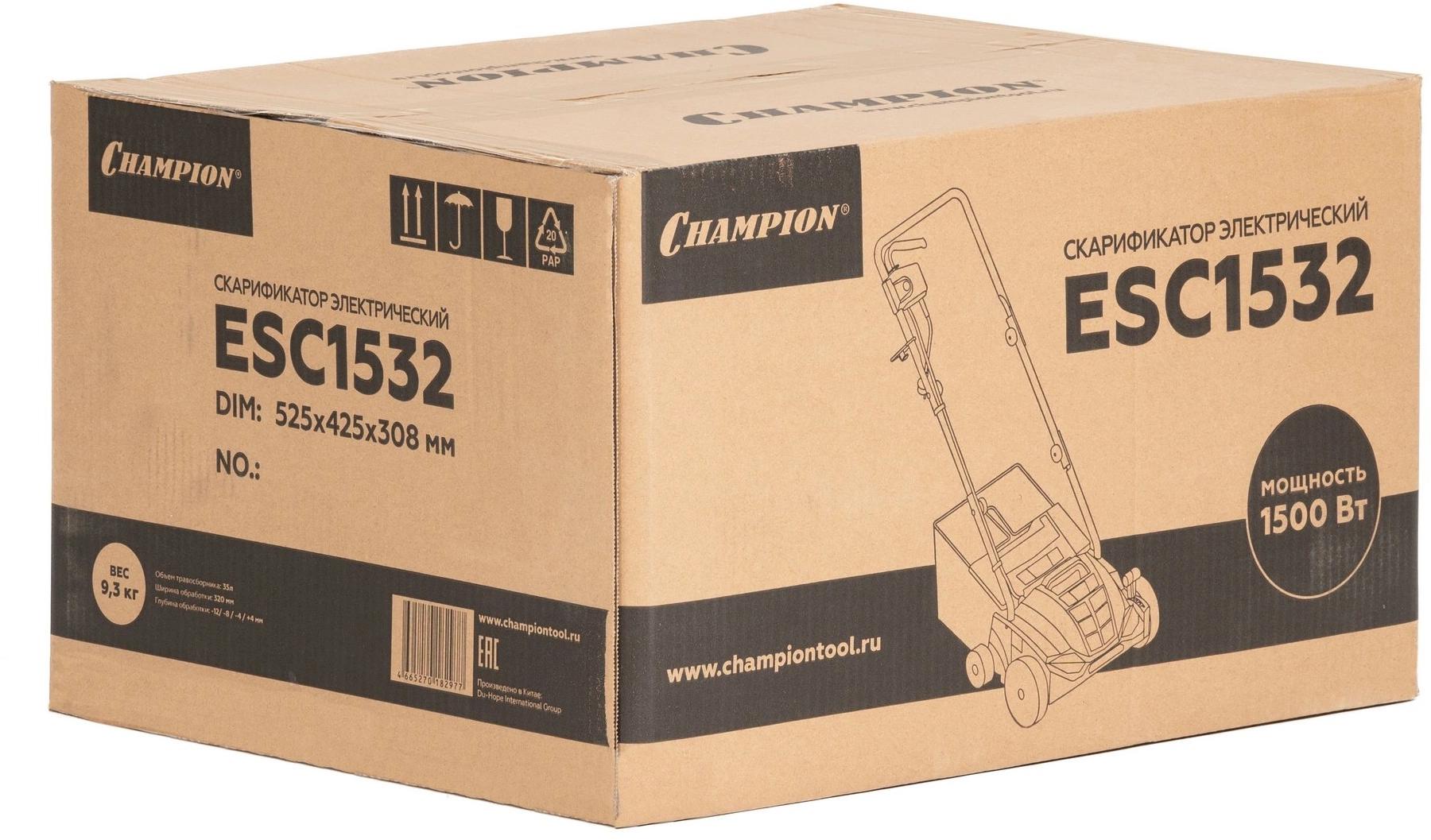 Champion ESC1532 предназначен для ухода за газонами. Подходит для выполнения различных задач: аэрации, очистки от сухой растительности, мха, мусора. Модель не выделяет выхлопных газов и отличается легкостью. Центральный рычаг имеет четыре положения для регулировки глубины обработки.