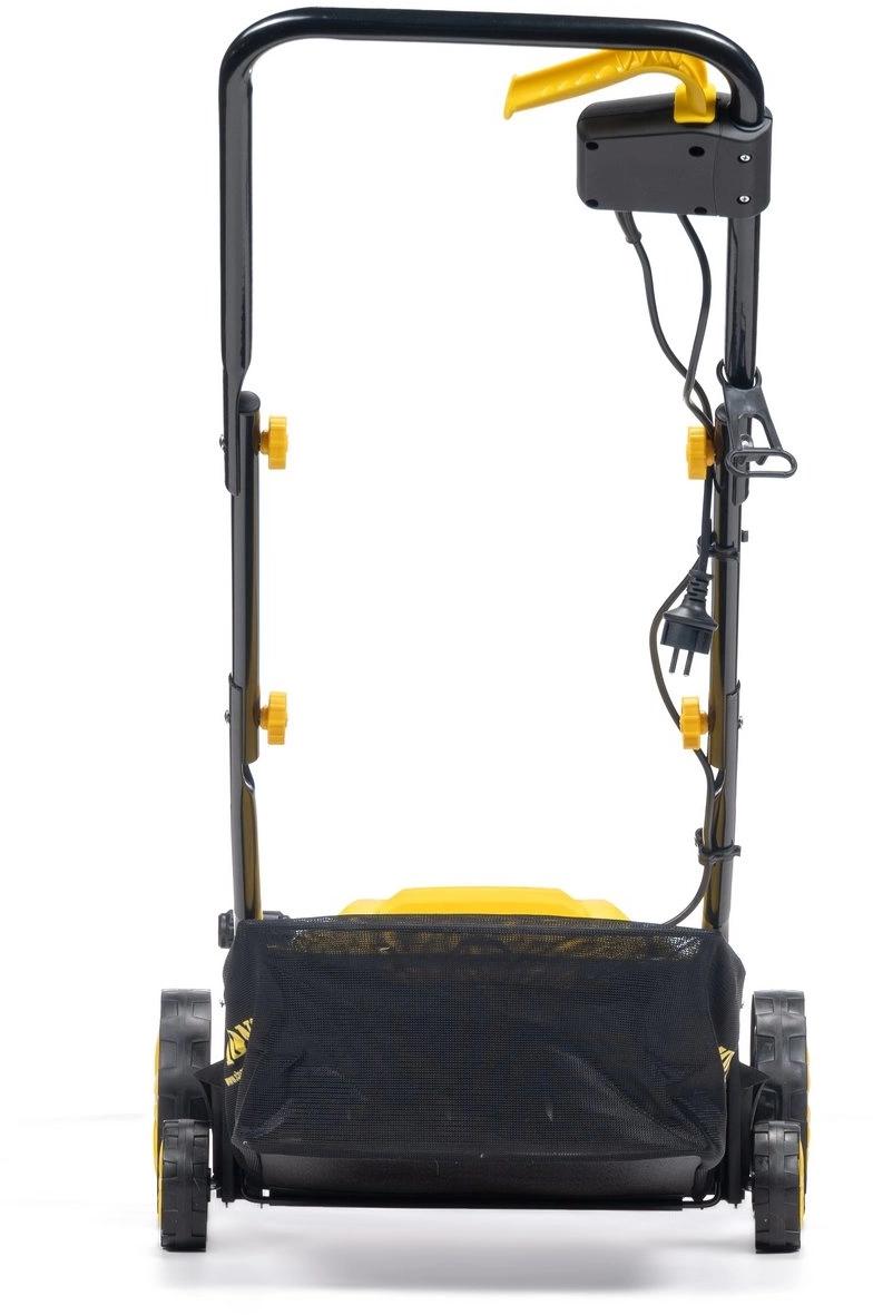 Маневренность. Большие колеса способствуют хорошей проходимости. Удобство управления. Основные органы управления вынесены на рукоятку, что обеспечивает комфорт во время использования. Вместительность. Вместительный травосборник 35л. Регулировка глубины обработки производится с помощью рычага.