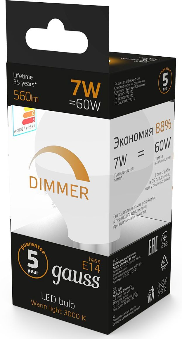 Лампа светодиодная Gauss 7Вт цок.:E14 шар 220B св.свеч.бел.теп. (упак.:1шт) (105101107-D)