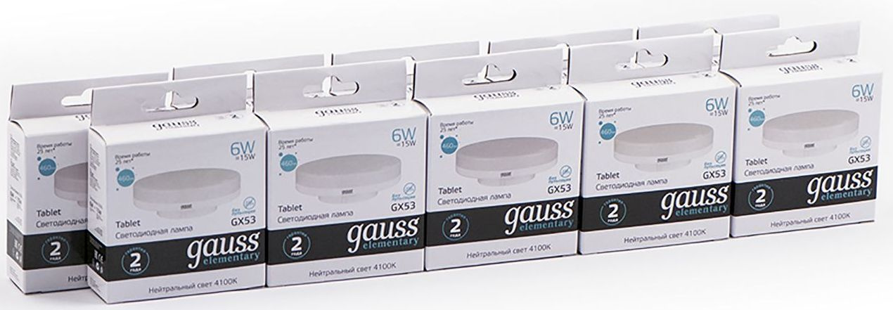 Лампа светодиодная Gauss Elementary GX53 6Вт цок.:GX53 таблетка 220B св.свеч.бел.нейт. (упак.:10шт) (83826)