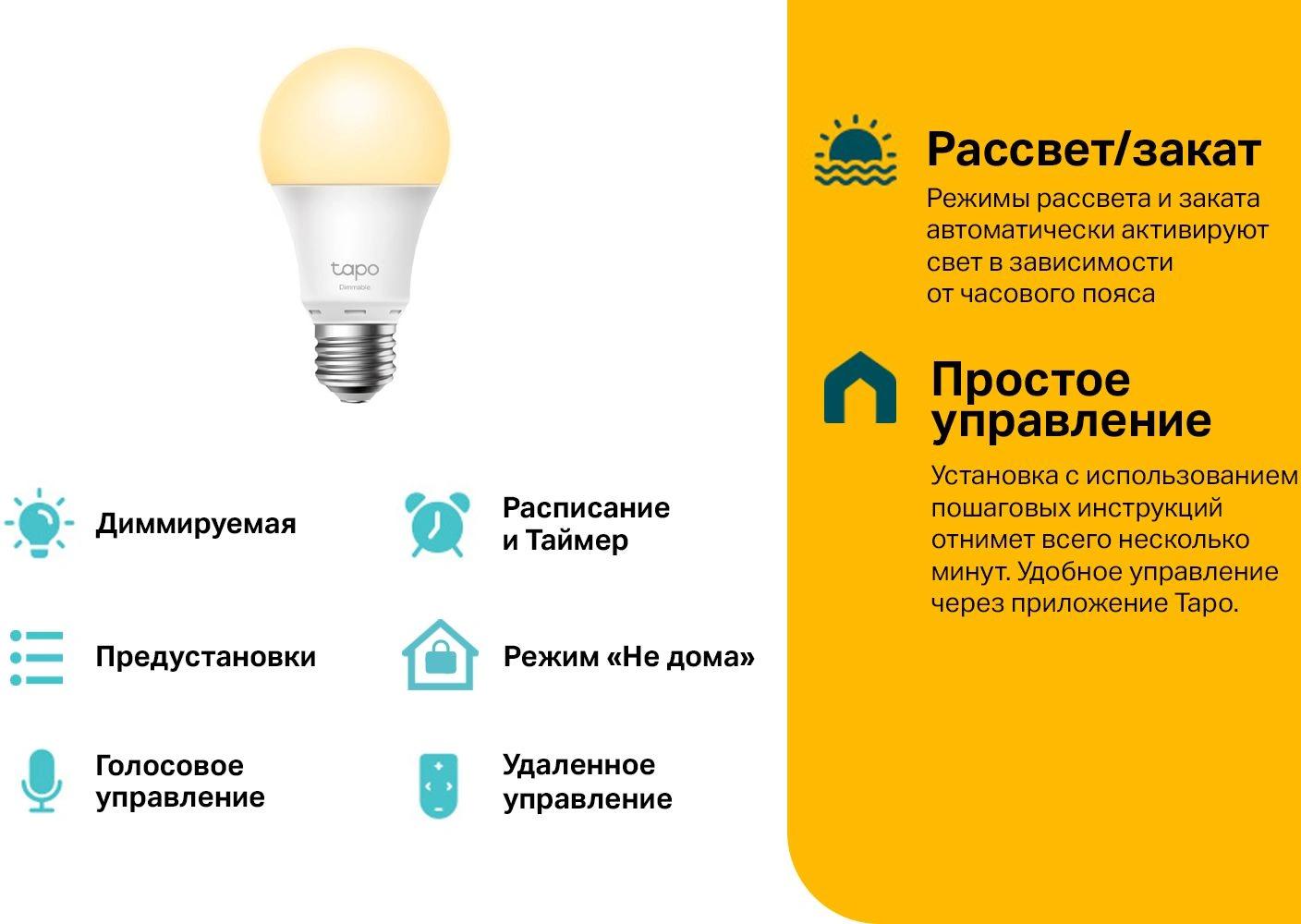 Умная диммируемая Wi-Fi лампа. Удалённое управление светом из телефона через приложение Tapo. Управляйте светом голосовыми командами при помощи Маруси, Яндекс Алисы или Google. Автоматическая активация света в зависимости от часового пояса. Работает по расписанию на заданной яркости в нужное время