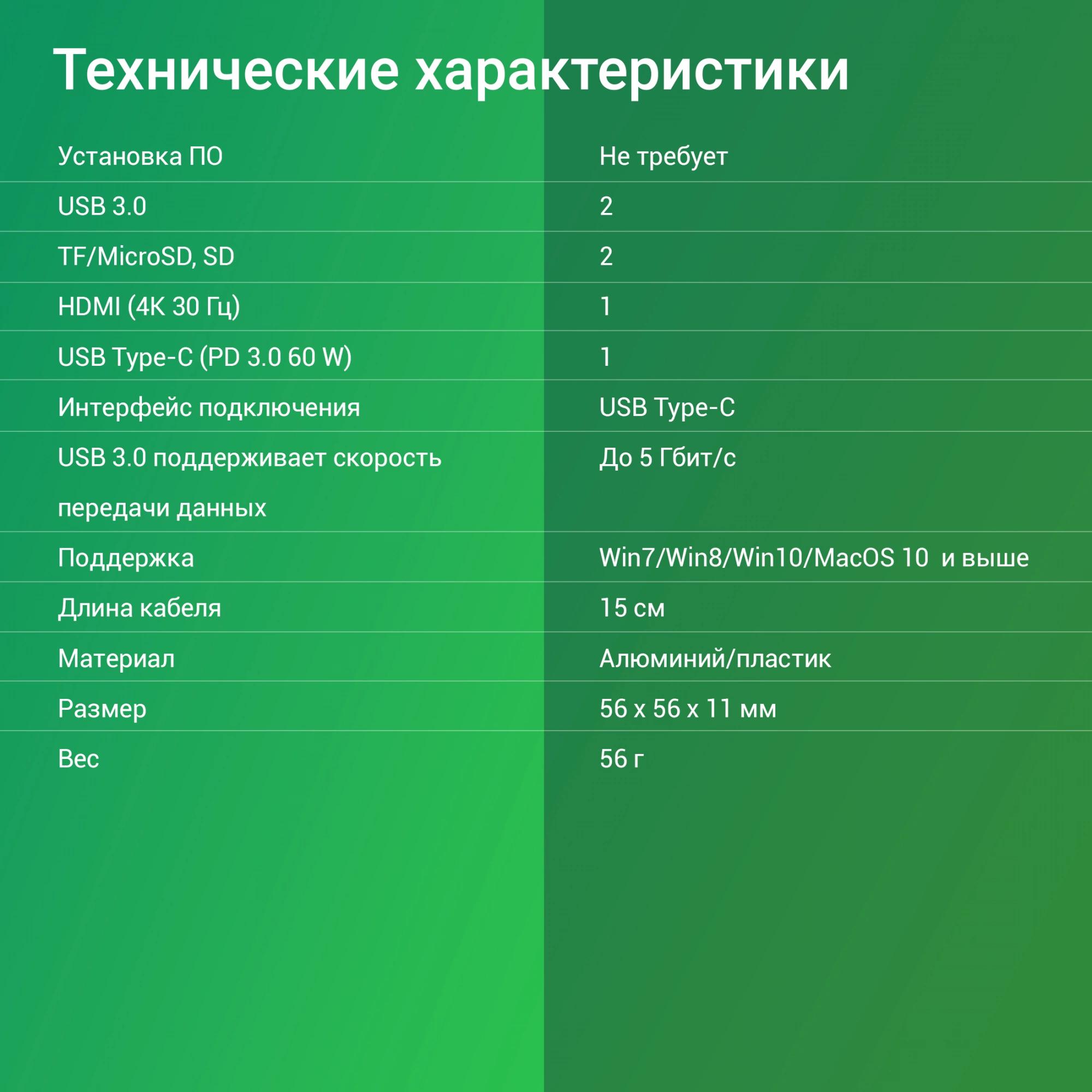HDMI (4K@30HZ, FULL HD@60Hz). Поддержка карт памяти microSD и SD. Дополнительный порт USB Type-C с поддержкой PowerDelivery 3.0 60Вт. Длина кабеля - 15 см. Не требует дополнительного питания