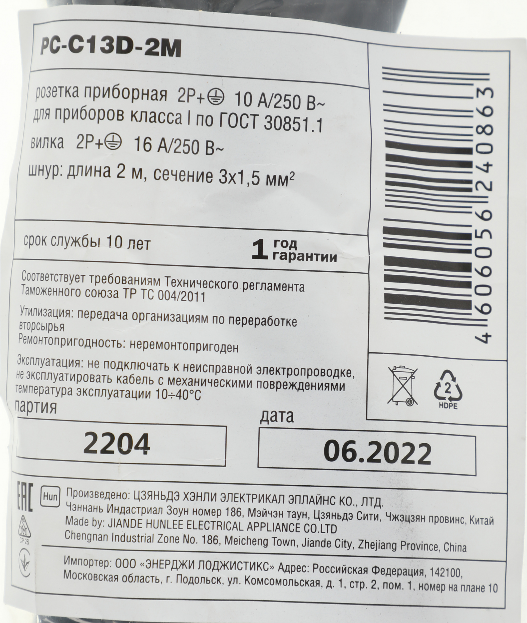 Шнур питания ITK PC-C13D-2M C13-Schuko проводник.:3x1.5мм2 2м 230В 10А черный