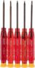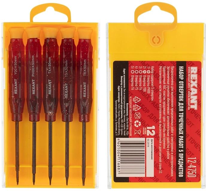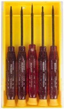 Набор отверток из 5 предметов для выполнения высокоточных прецизионных работ в электронике и электромеханике. Отвертки оснащены эргономичной рукояткой. Выполнены из ударопрочного ABS-пластика. Металлические части изготовлены из стали S2: прочные и долговечные, заточены под предельную соразмерность.