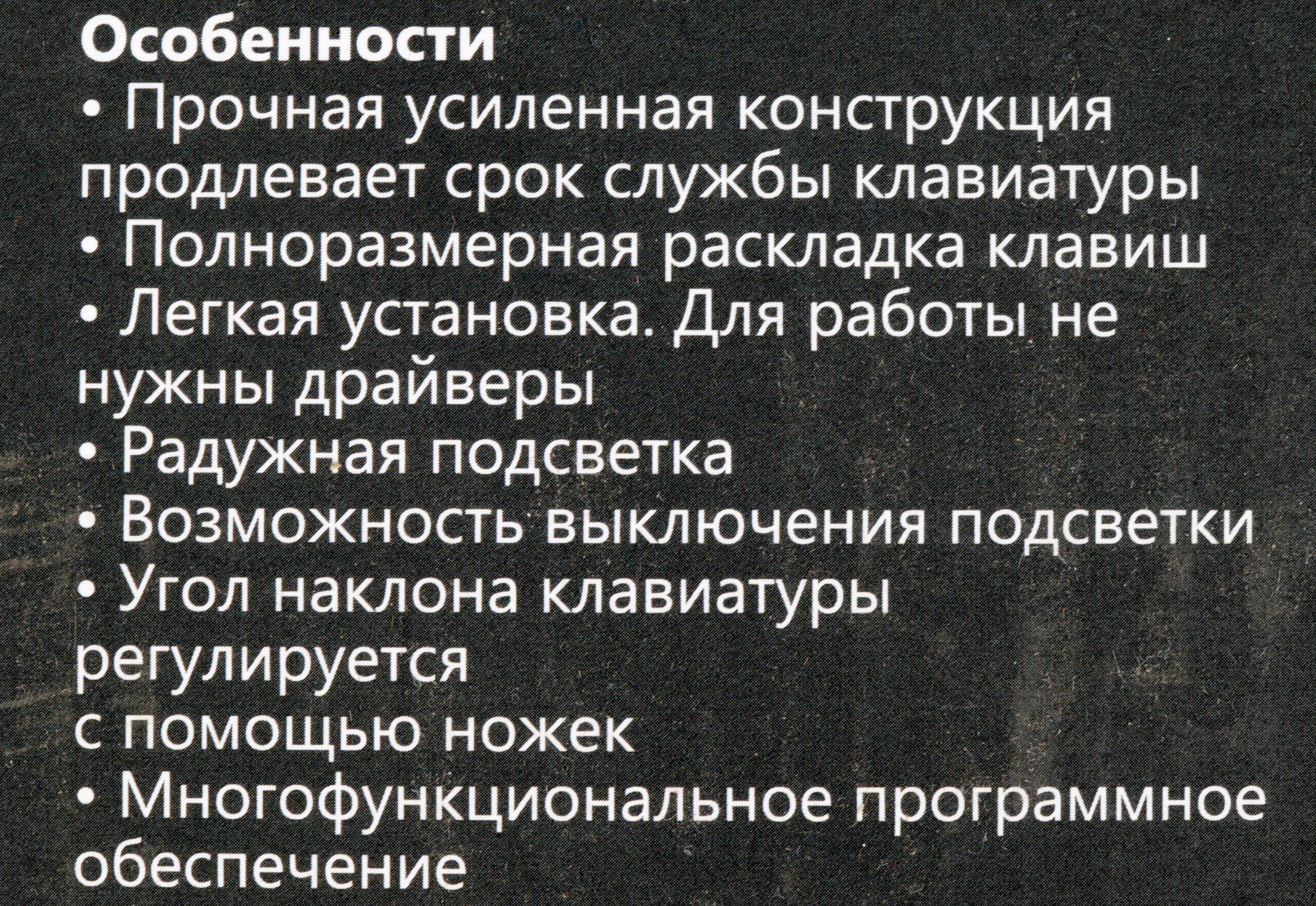 Прочная усиленная конструкция продлевает срок службы клавиатуры. Радужная подсветка. Возможность выключения подсветки. Угол наклона клавиатуры регулируется с помощью ножек. Многофункциональное программное обеспечение.