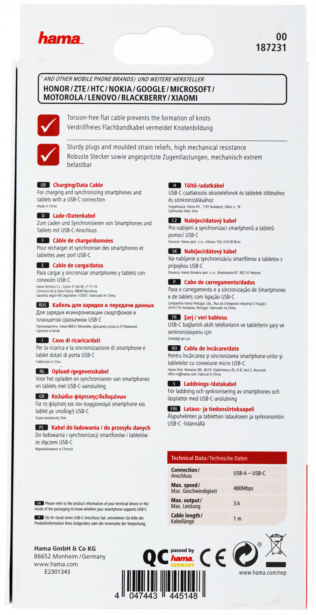 Кабель HAMA для передачи данных между персональными компьютерами и смартфонами, планшетами, MP3-плеерами и прочими устройствами с разъемом USB Type-C.
