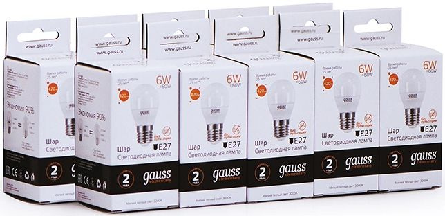 Лампа светодиодная Gauss Elementary 6Вт цок.:E27 шар 220B св.свеч.бел.теп. (упак.:10шт) (53216)