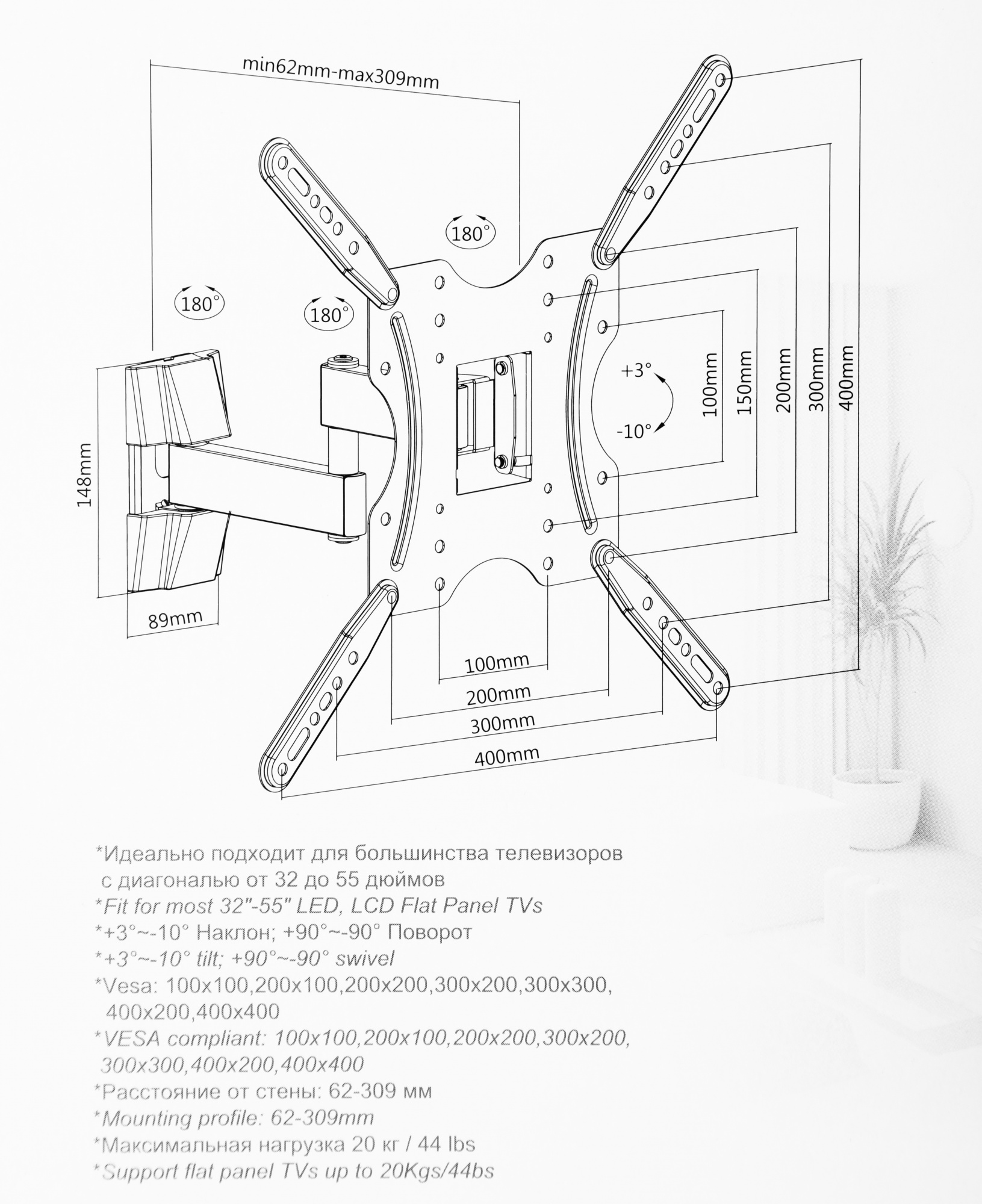 Подходит для телевизоров c диагональю