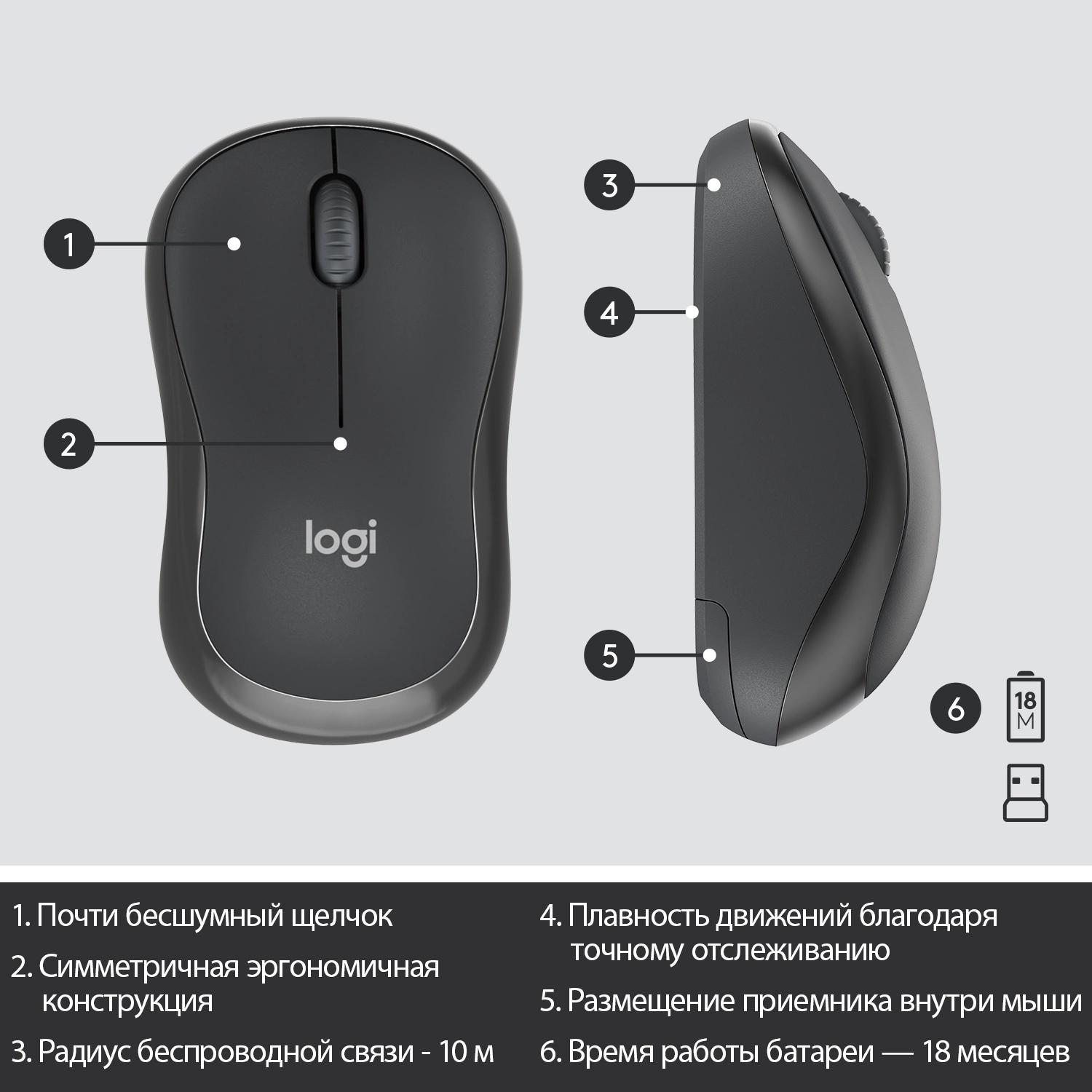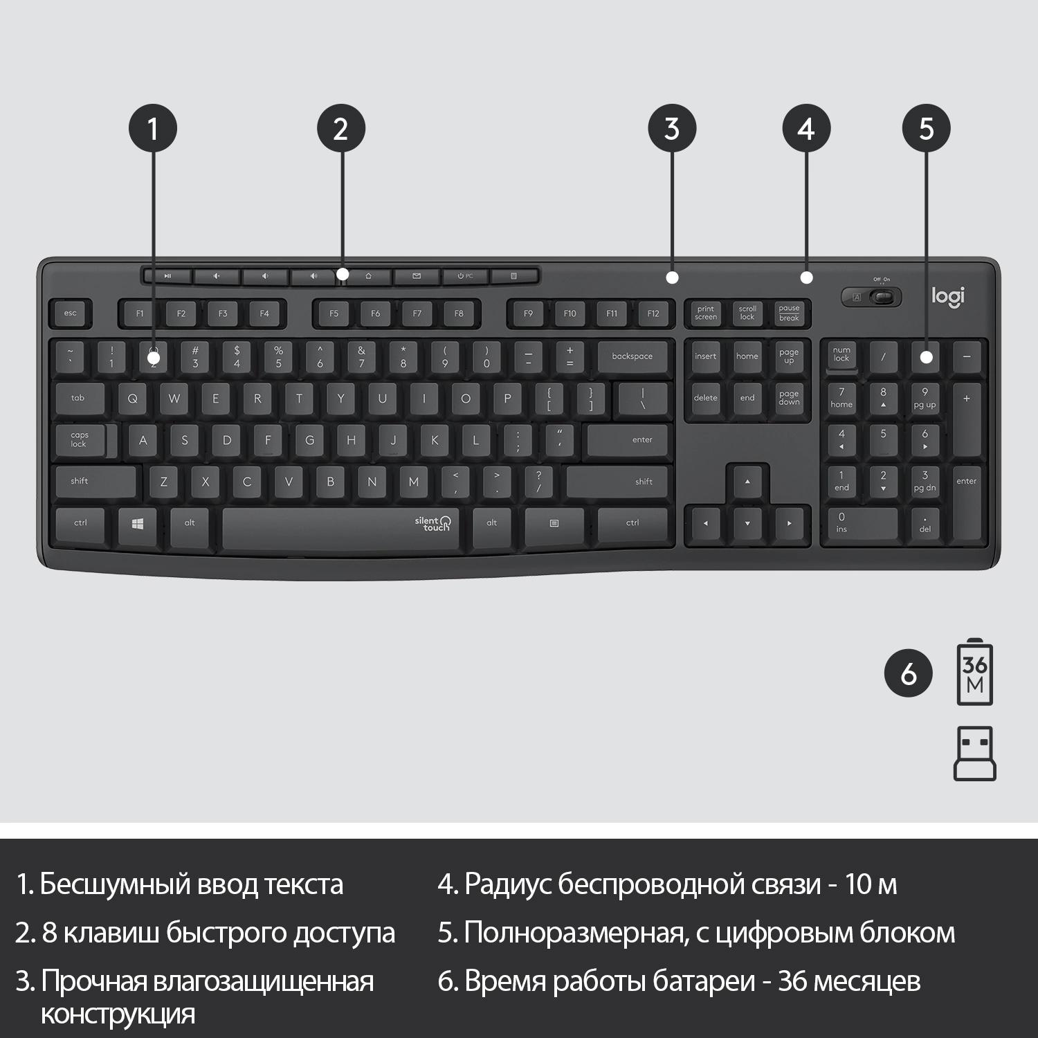 Технология SilentTouch. Регулируемая высота клавиатуры. Влагозащищенная конструкция. Беспроводное соединение, работающее на частоте 2, 4 ГГц (10 метров). USB-наноприемник. Индикатор Caps Lock. Выключатель питания.