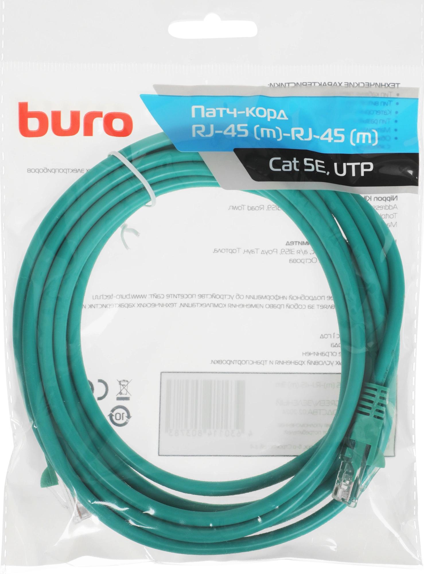 Патч-корд Buro UTP-5E-3M-GR UTP 4 пары cat.5E CCA molded 3м зеленый RJ-45 (m)-RJ-45 (m)