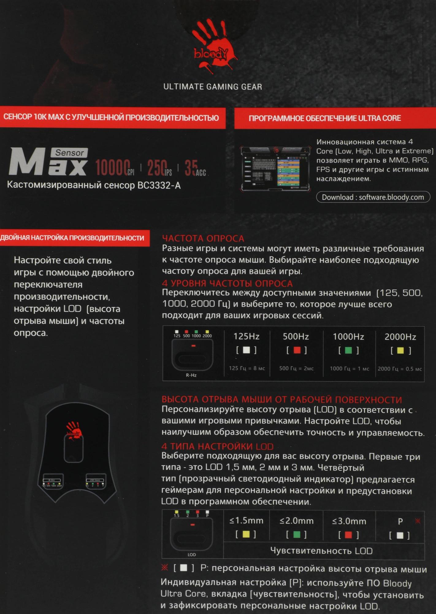 Персонализируйте высоту отрыва в соответствии с вашими игровыми привычками (4 типа настройки LOD). при установке ПО Bloody7, уровни core3, 4 активированы бесплатно