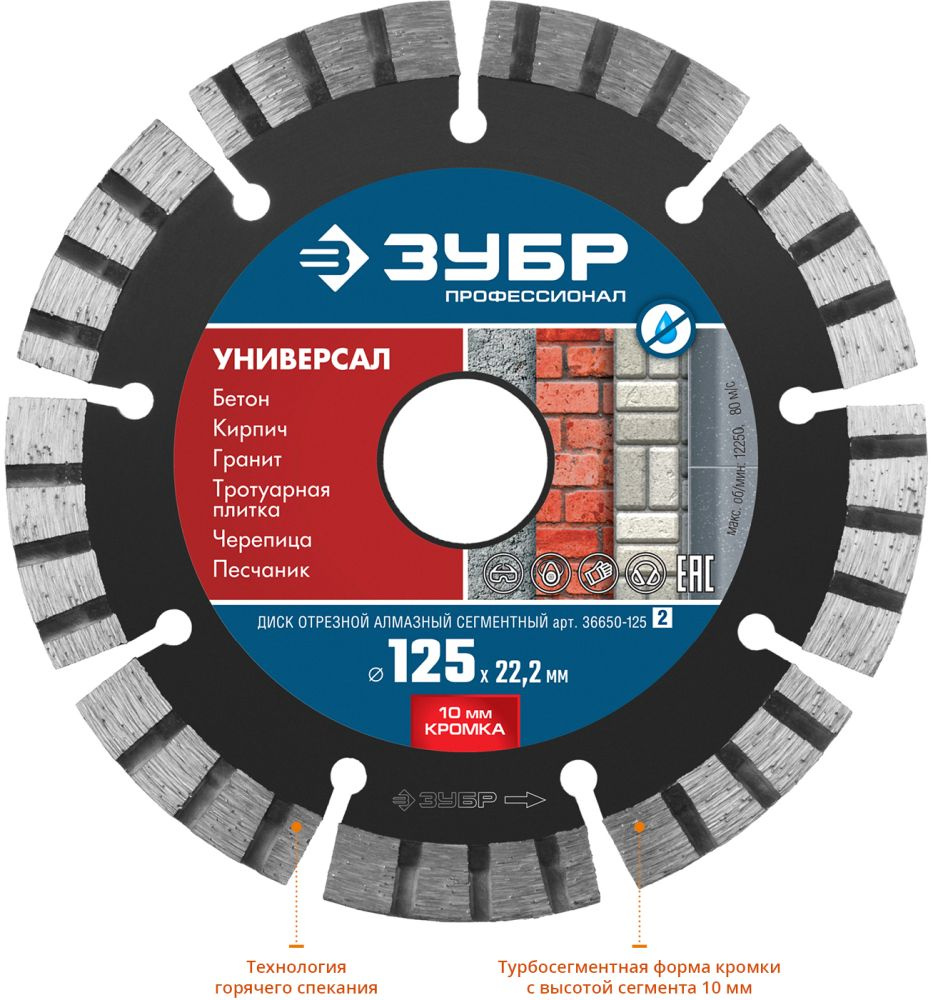 Диск алмазный по бет. Зубр 36650-125 (36650-125_Z02) d=125мм d(посад.)=22.2мм (угловые шлифмашины) (упак.:1шт)