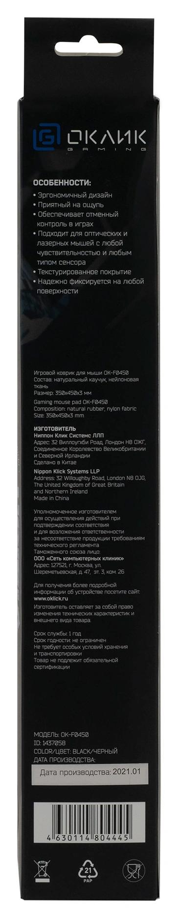 Коврик для мыши Оклик OK-F0450 Большой черный 450x350x3мм