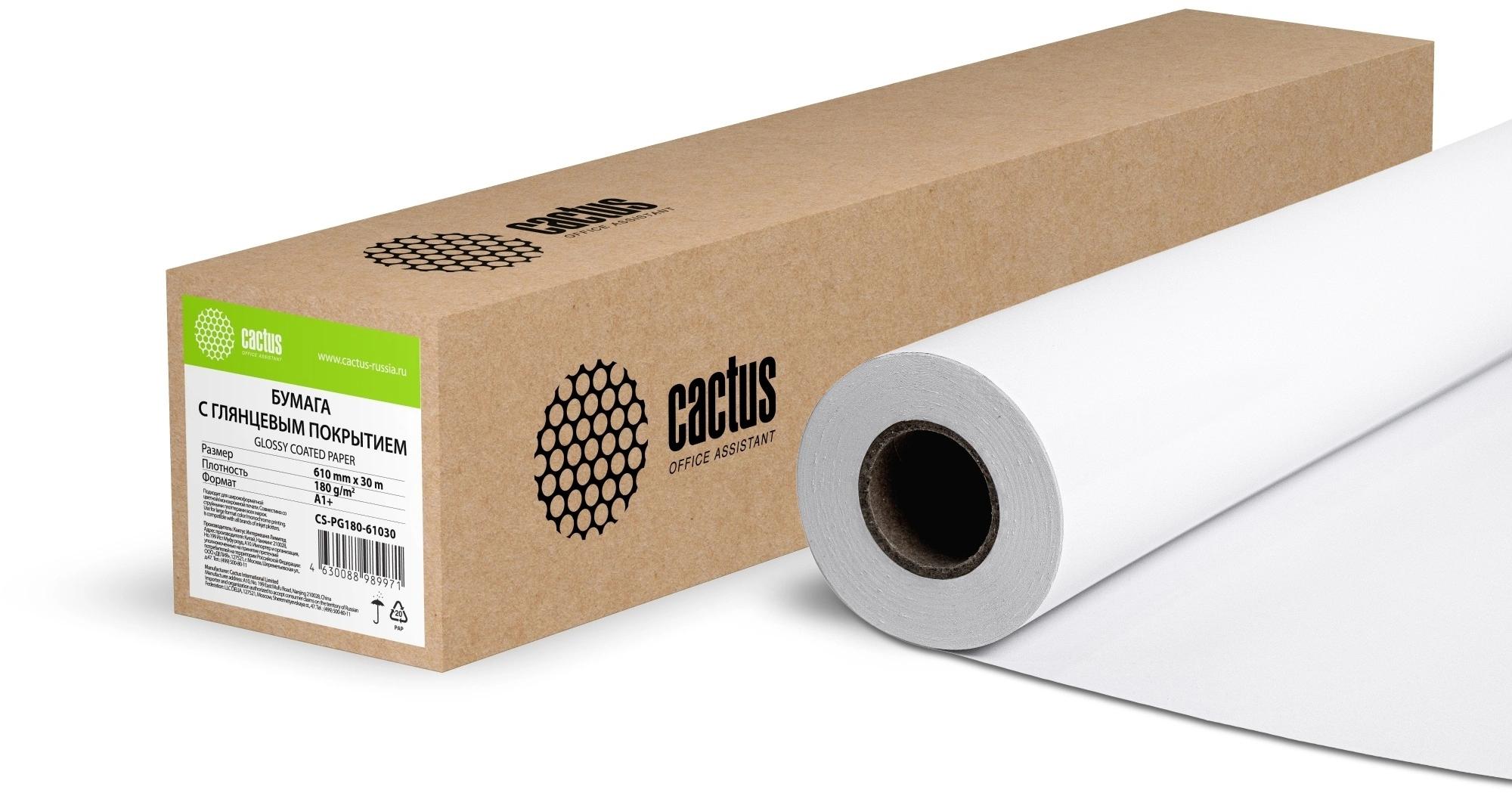 Бумага Cactus CS-PG180-61030 24"(A1) 610мм-30м/180г/м2/белый глянцевое для струйной печати втулка:50.8мм (2")