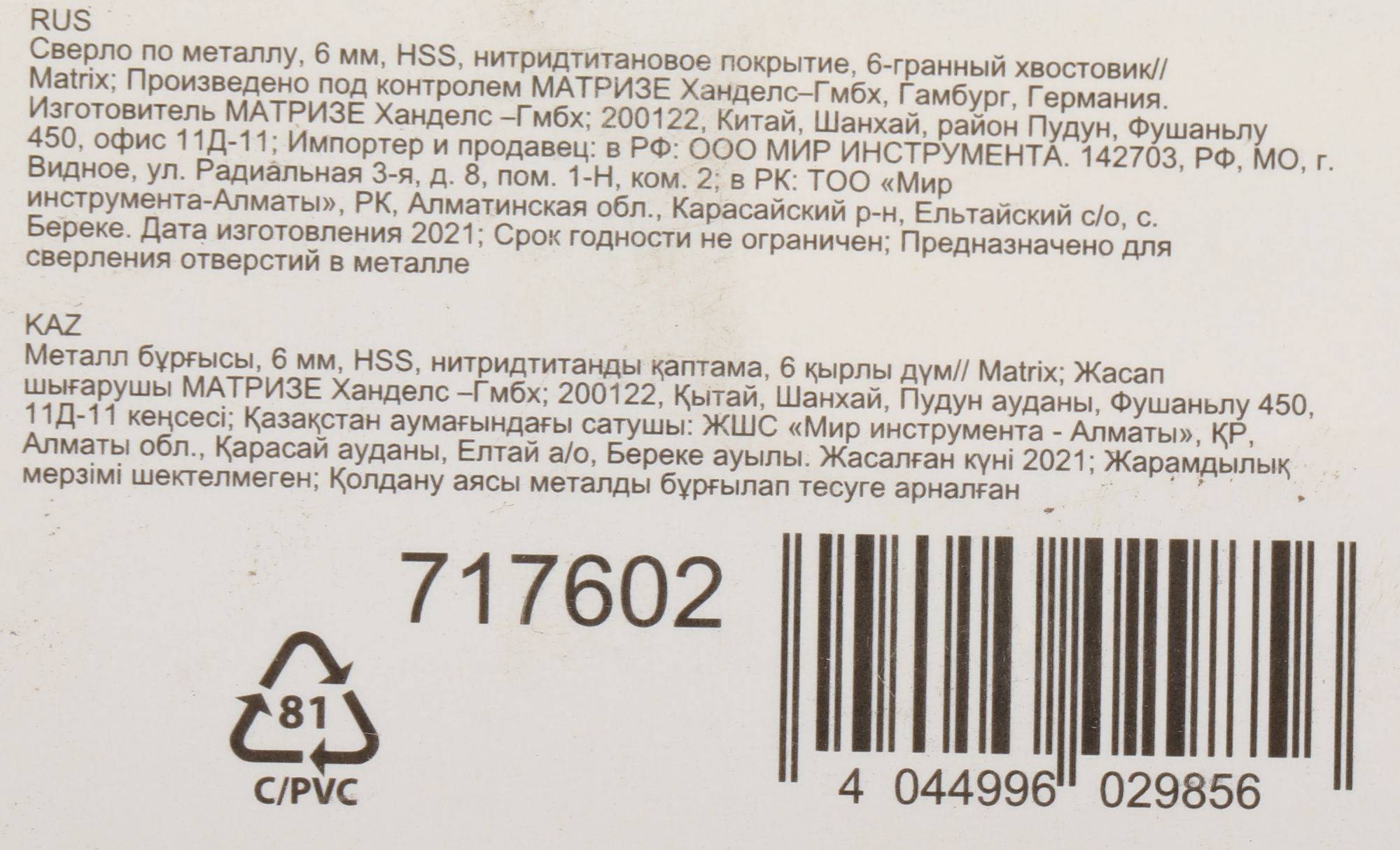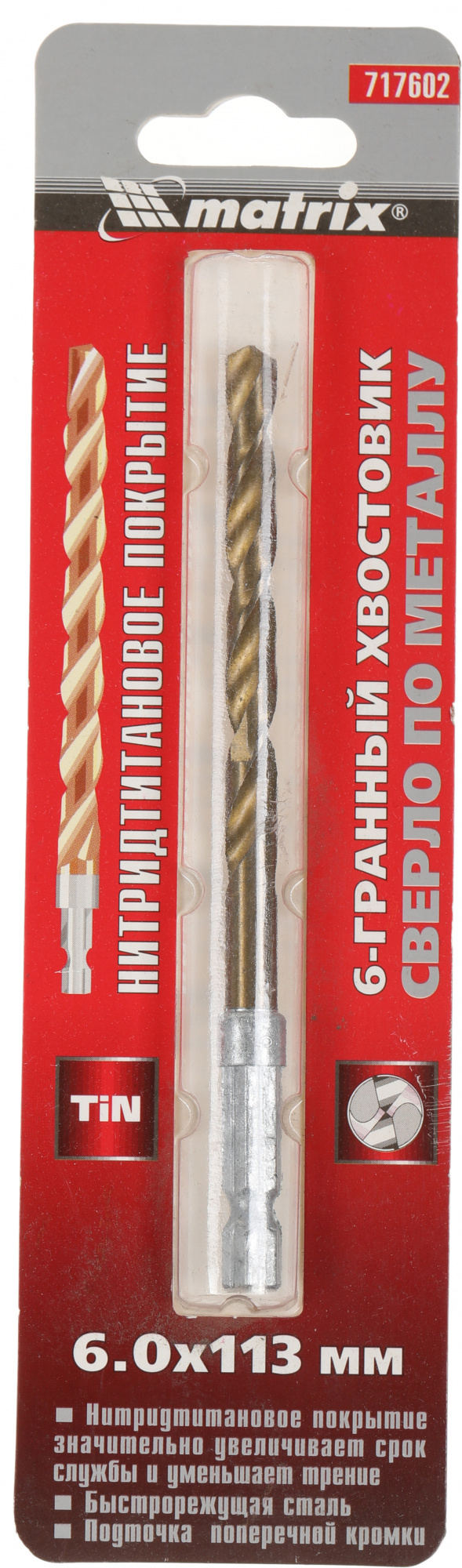 Сверло Matrix 717602 по металлу Д=6мм Дл=113мм (1пред.) для дрелей