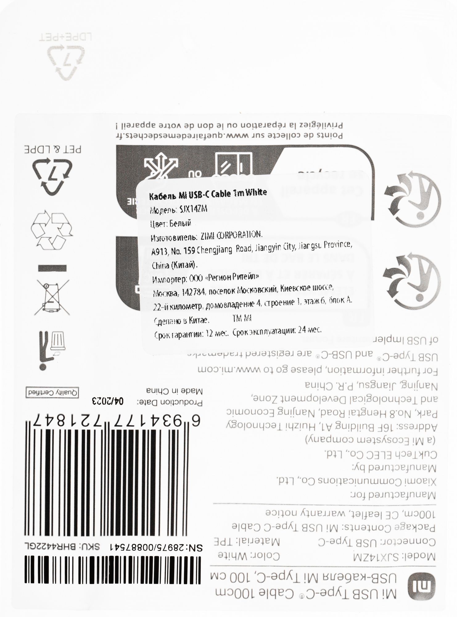 Кабель Xiaomi Mi USB Type-C Cable 100cm BHR4422GL USB (m)-USB Type-C (m) 1м белый