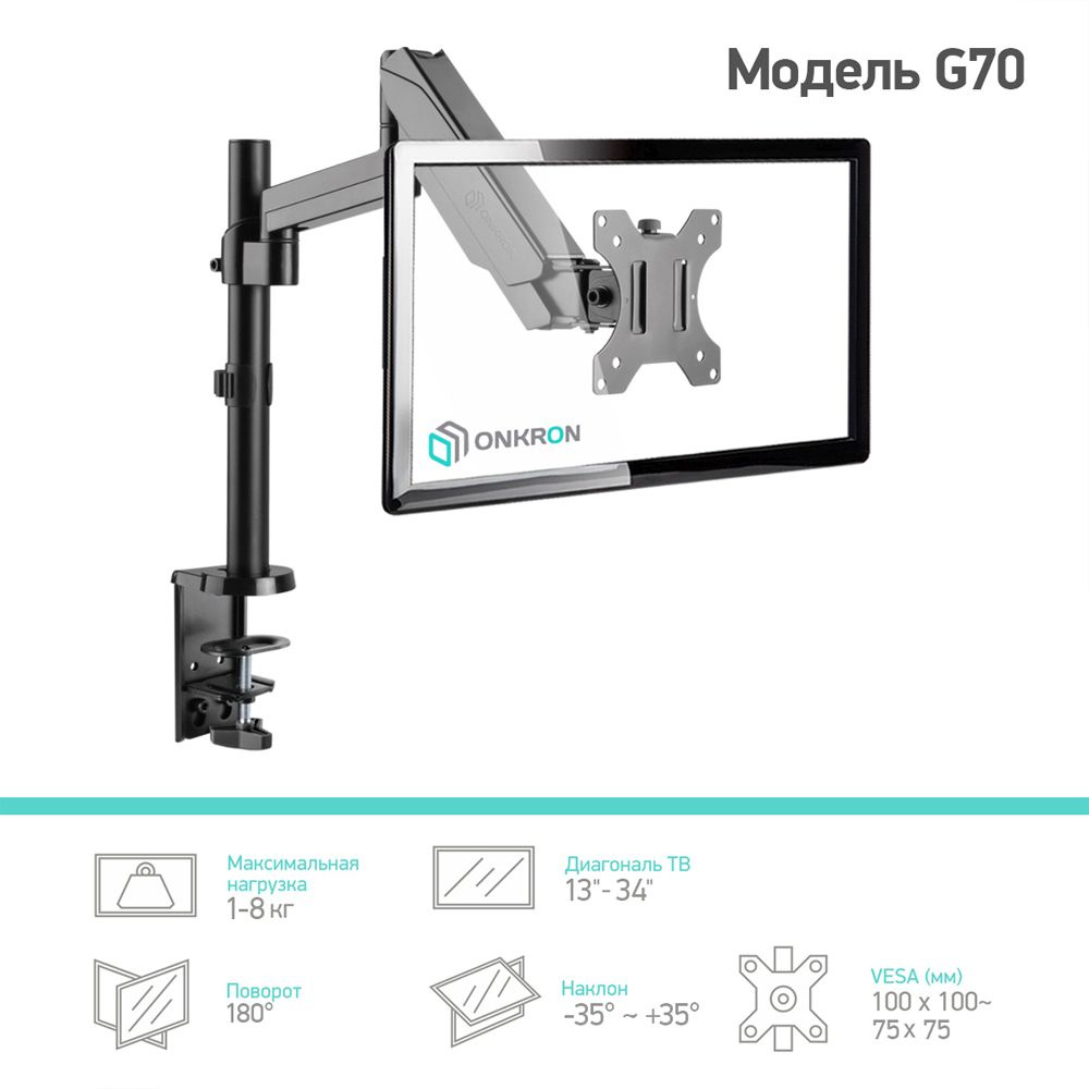 "Настольный наклонно-поворотный кронштейн для монитора, выполненный по технологии газлифт, подходит для мониторов и телевизоров диагональю от 13 до 34 дюймов и весом от 1 до 8 кг.