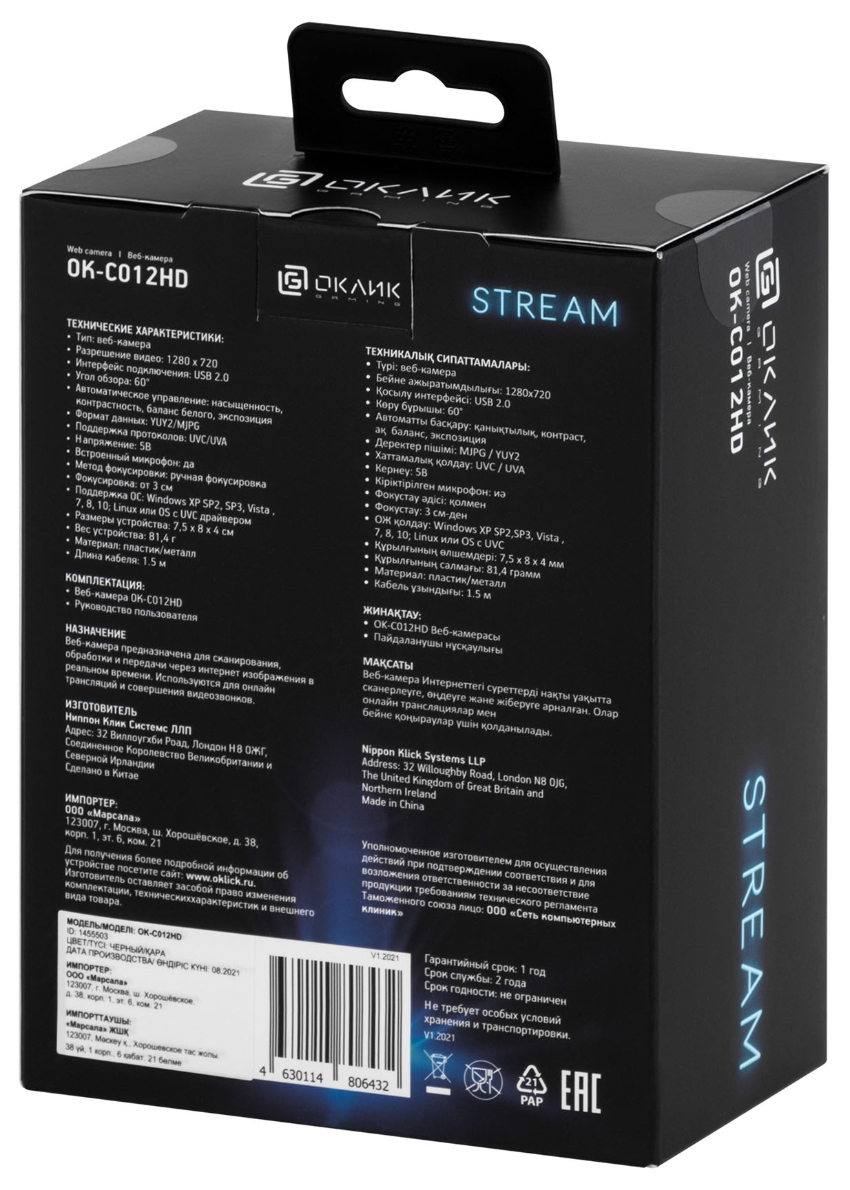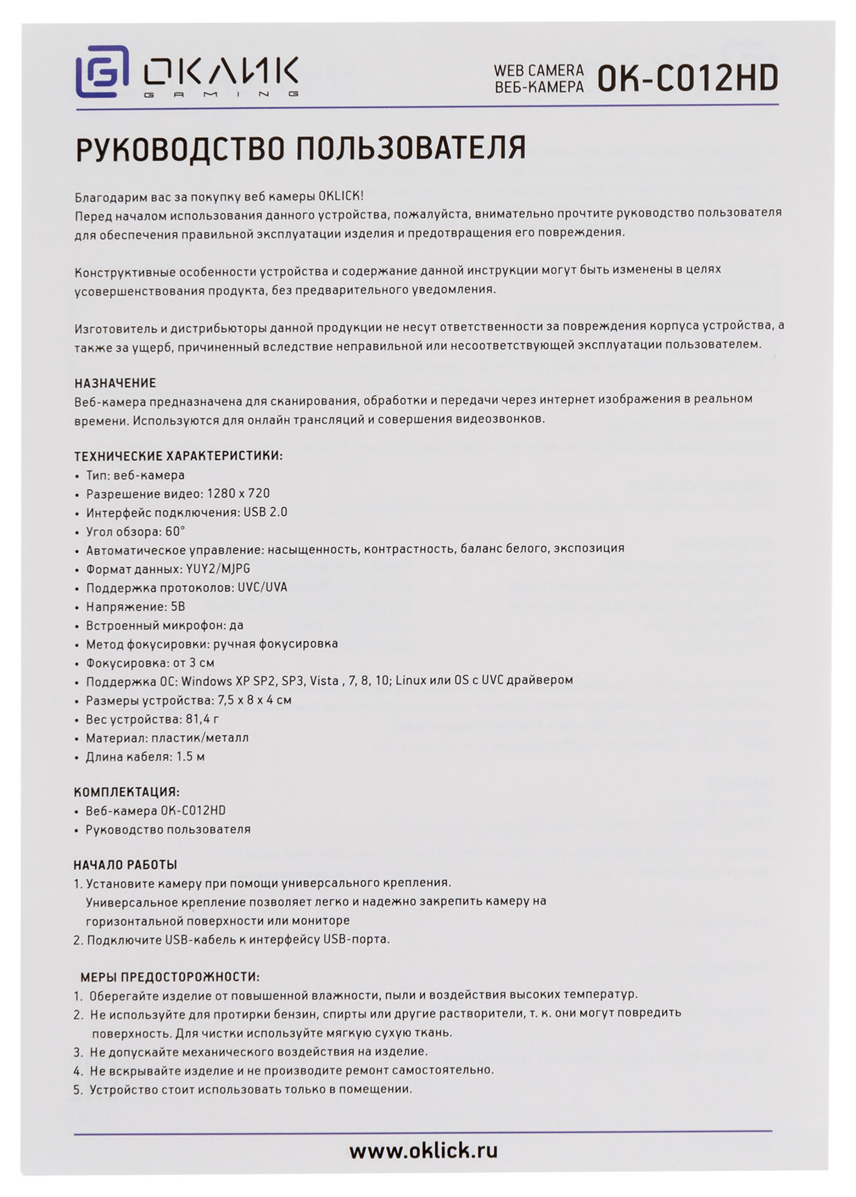 Камера Web Оклик OK-C012HD черный 1Mpix (1280x720) USB2.0 с микрофоном