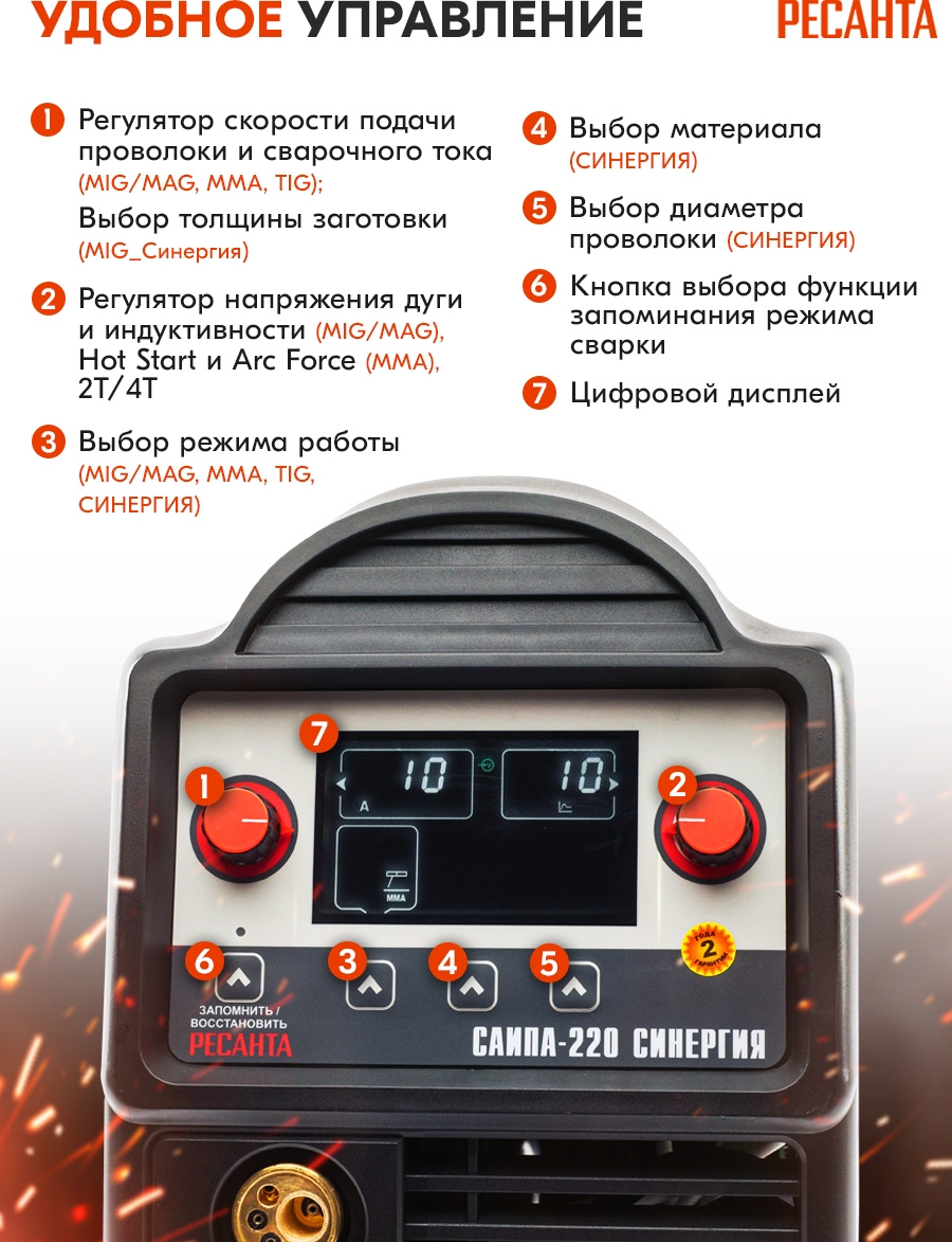 Режим СИНЕРГЕТИЧЕСКОЕ управление – выставление всех значений параметров сварки минимальным количеством настроек. Аппарат оснащен различными функциями: сварка MIG/MAG, сварка FCAW, ручная дуговая сварка ММА, ручная дуговая сварка TIG.