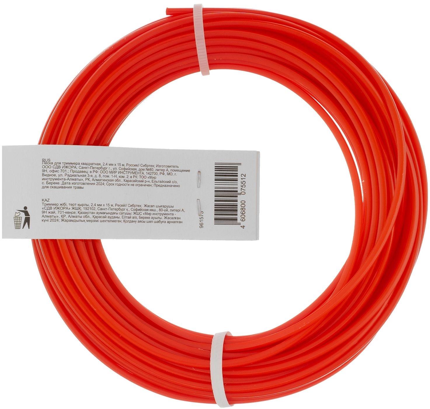 Леска для триммера с квадратным сечением длиной 15 метров и диаметром 2.4 мм применяется в электрических и бензиновых триммерах. Изготовлена из нейлона. Обладает высокой износостойкостью. Подходит для скашивания густой зеленой травы и сухого многолетнего кустарника.