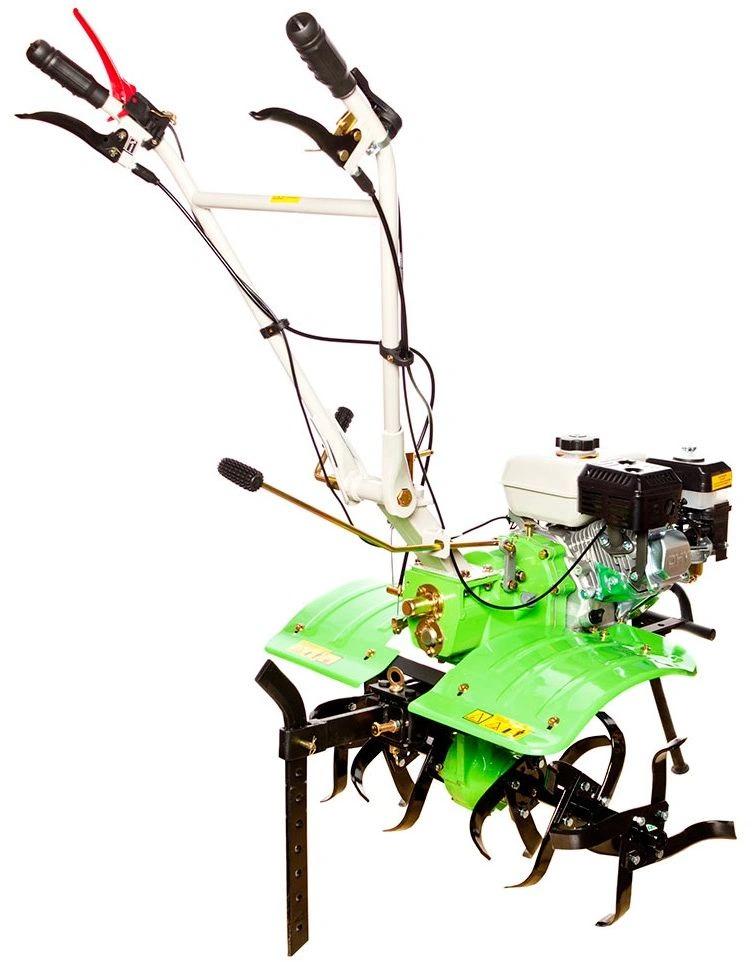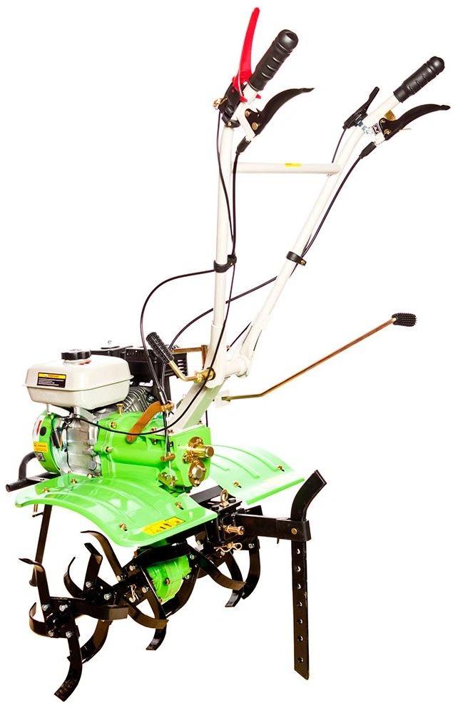 Рукоятка управления, бензиновый двигатель, сошник, защитные щитки, складная подставка, редуктор, без колес (приобретаются отдельно).