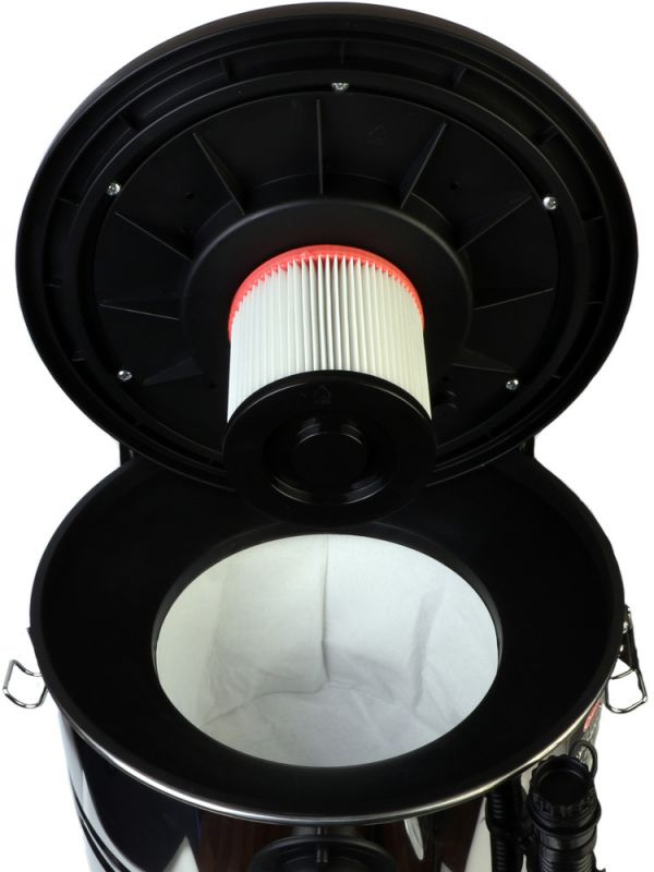 Розетка для подключения электроинструмента мощностью до 2000 Вт. Удобные поворотные колеса. Многоразовый складчатый фильтр НЕРА.