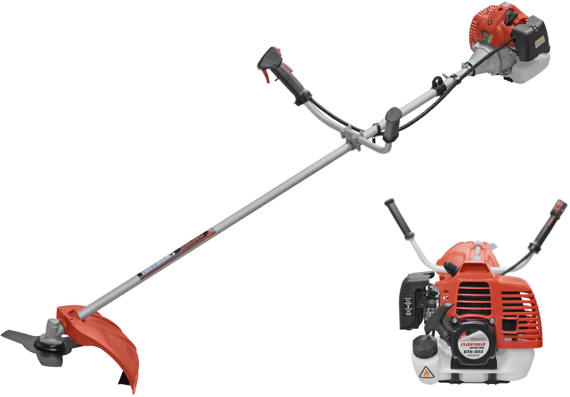 Легкий доступ к воздушному фильтру. Удобное управление, вынесенное на рукоятку. Наплечный ремень в комплекте. Трехлопастной нож в комплекте. Сменный режущий инструмент. Хромированный цилиндр.