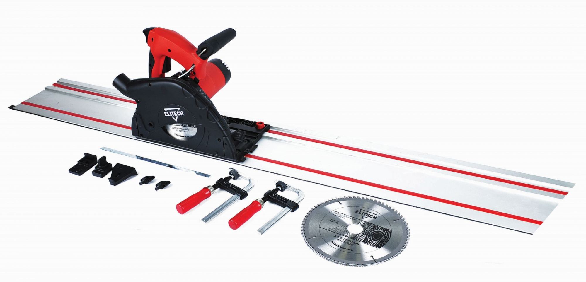 Циркулярная пила, направляющая шина 1400 мм, соединитель направляющих шин, струбцина 2 шт., стопор, антиопрокидыватель, инструкция, картонная коробка 2 шт. (пили и шина).