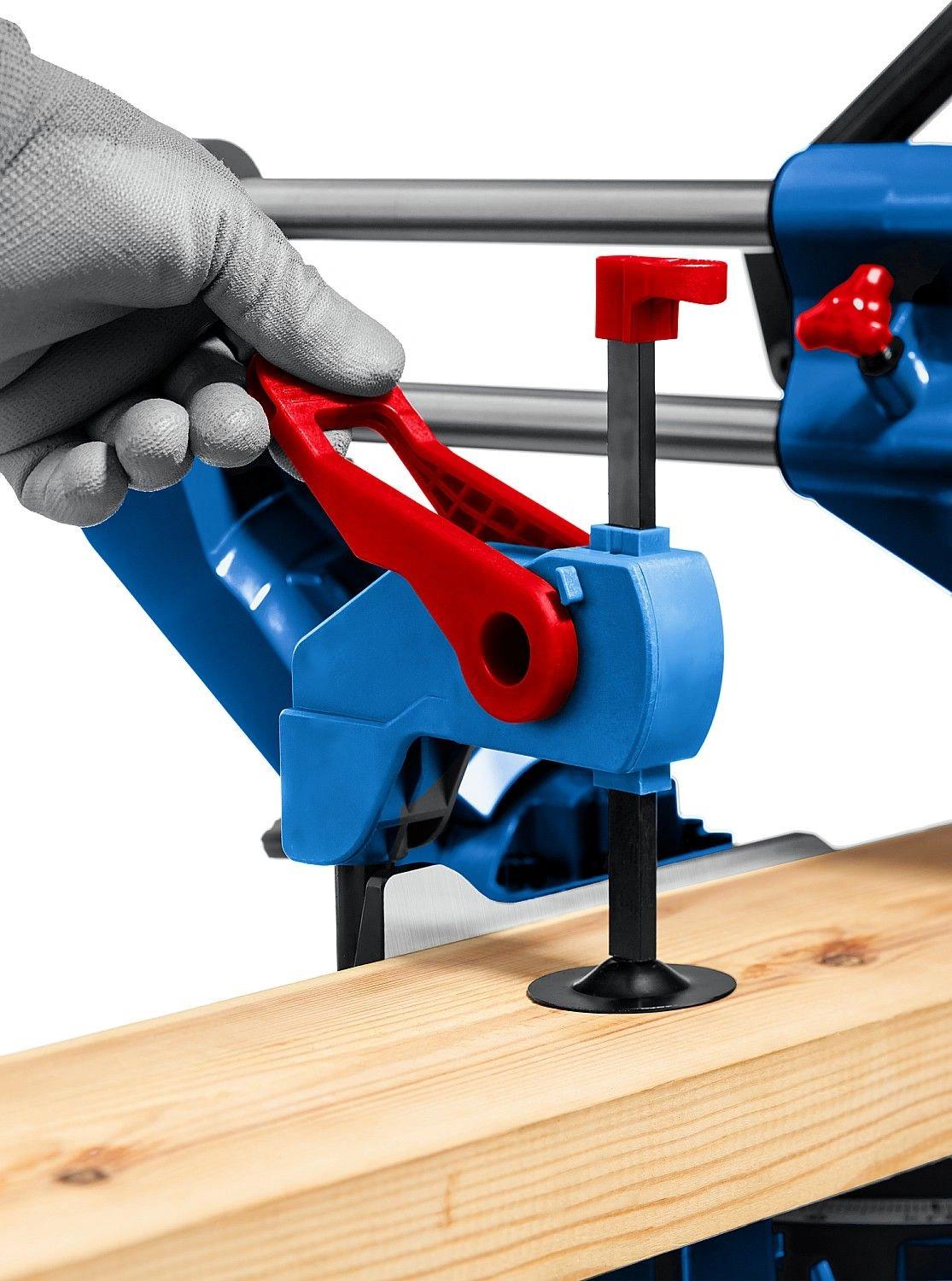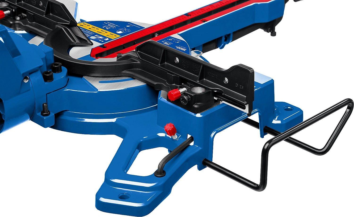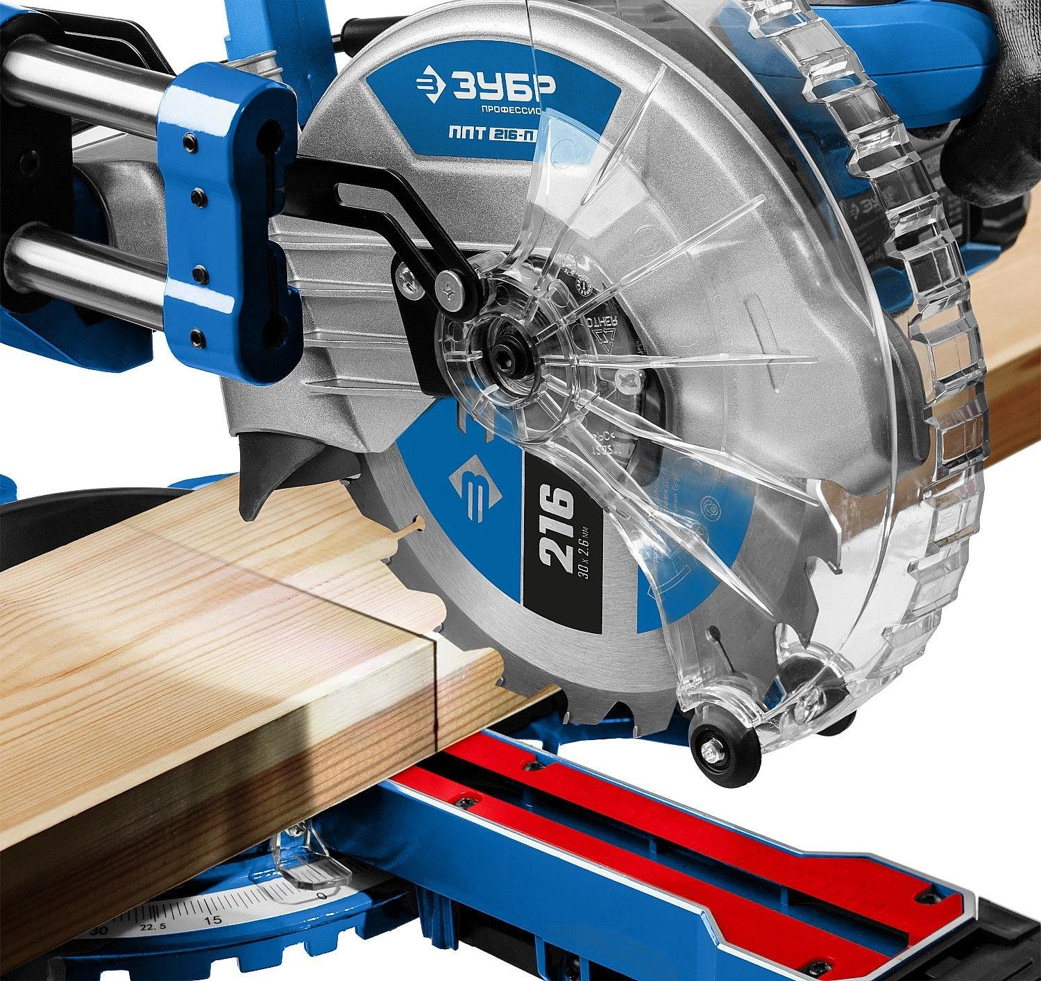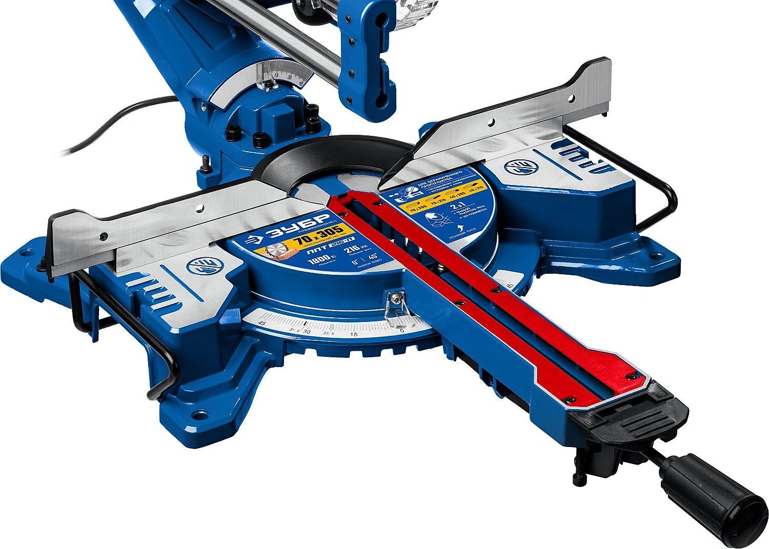 Высокая точность реза. Сдвижная консоль. Плавный пуск. Удобная регулировка наклона. LED-подсветка с указателем реза. Автоматически закрывающийся кожух. Удлинители стола.