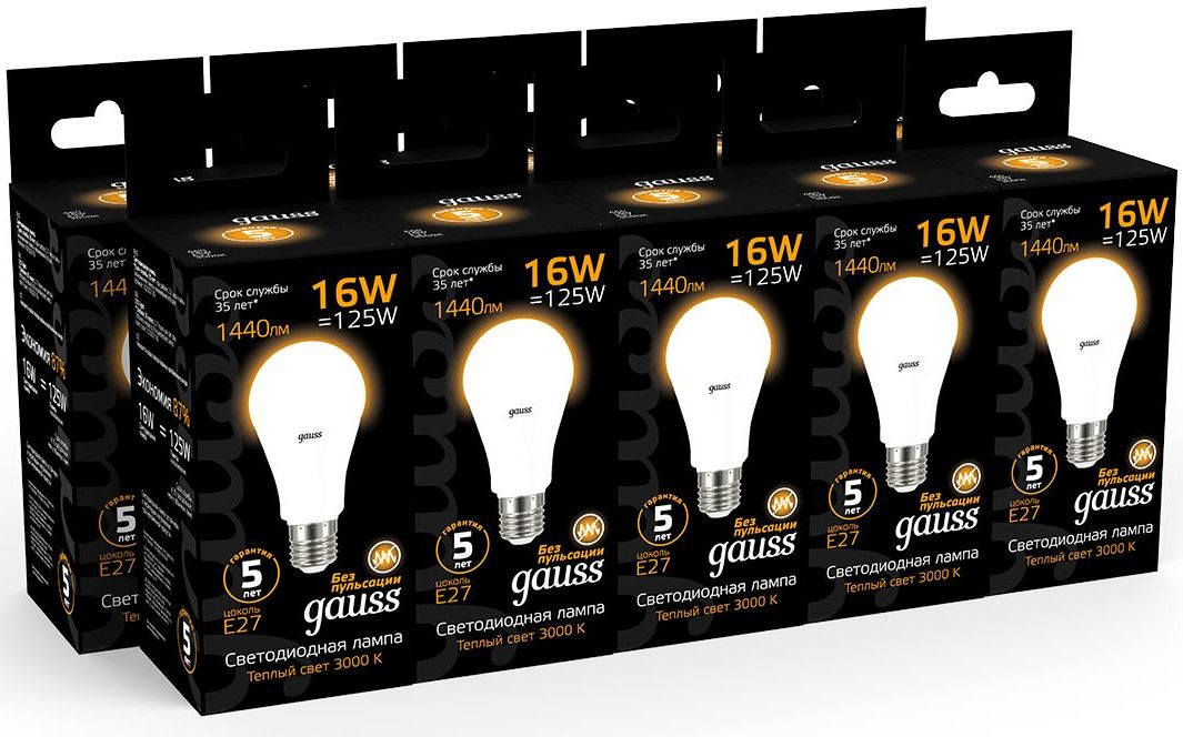 Лампа светодиодная Gauss 16Вт цок.:E27 шар 220B 3000K св.свеч.бел.теп. A60 (упак.:10шт) (102502116)
