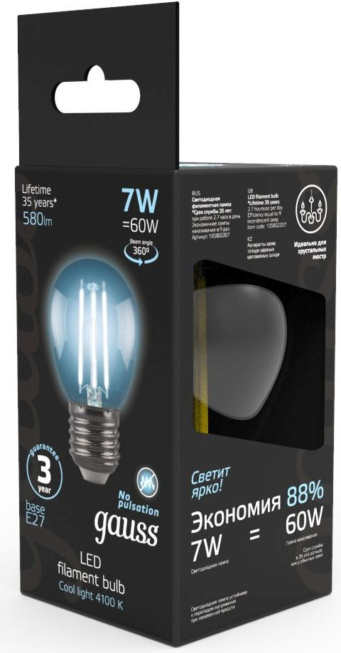 Лампа филам. Gauss 7Вт цок.:E27 шар 220B 4100K св.свеч.бел.нейт. G45 (упак.:10шт) (105802207)