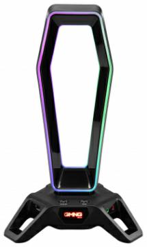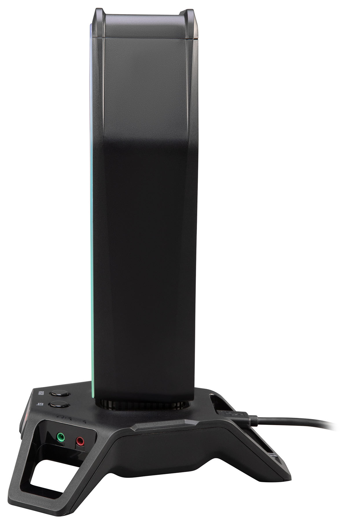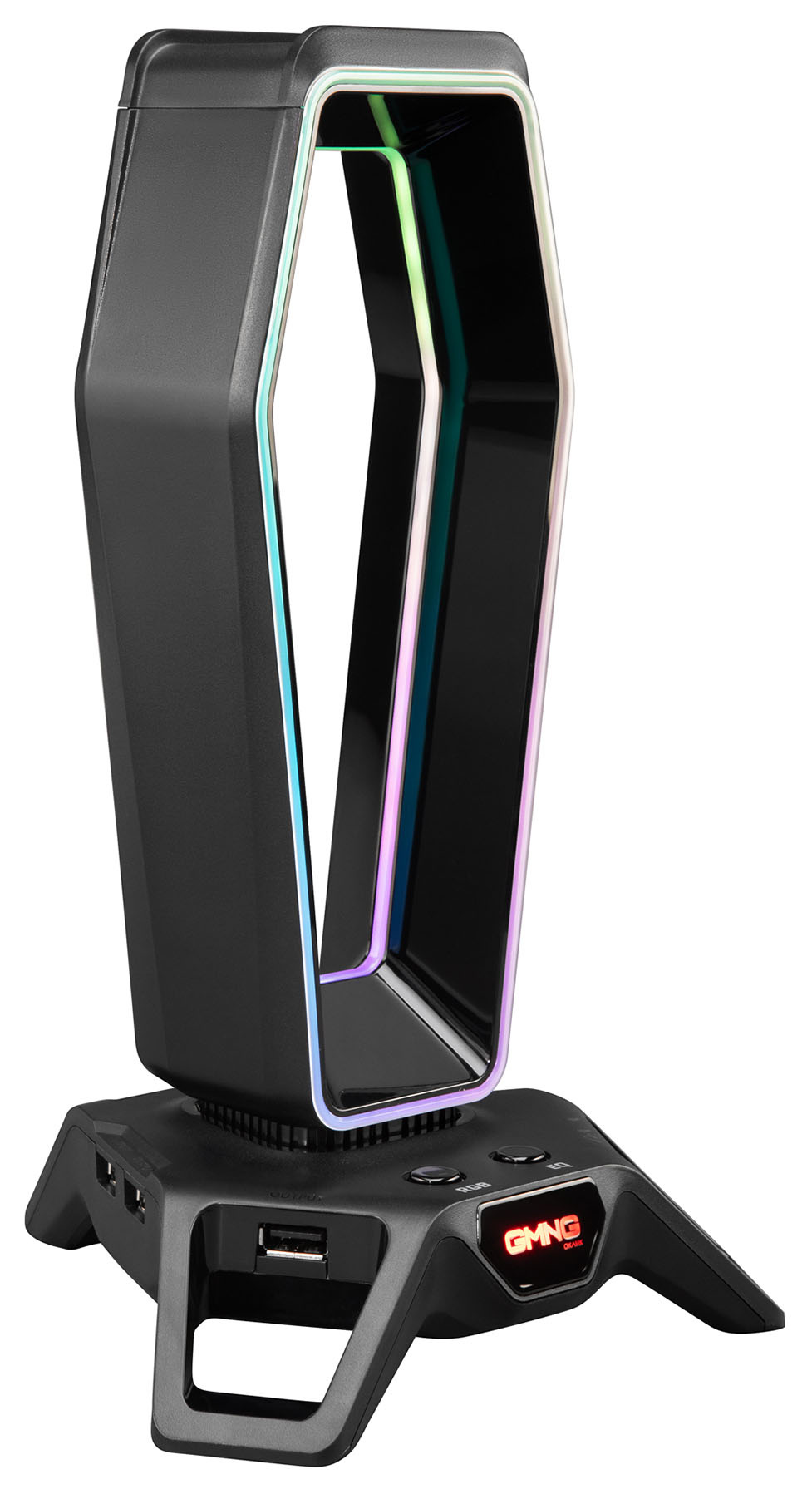 Настольная подставка для наушников. Изделие присоединяется к USB-порту компьютера или ноутбука и оснащается двумя акустическими разъемами 3.5 мм для раздельного подключения игровой гарнитуры и микрофона. USB-разъемы позволяют подключать накопители и мобильные устройства, требующие подзарядки.