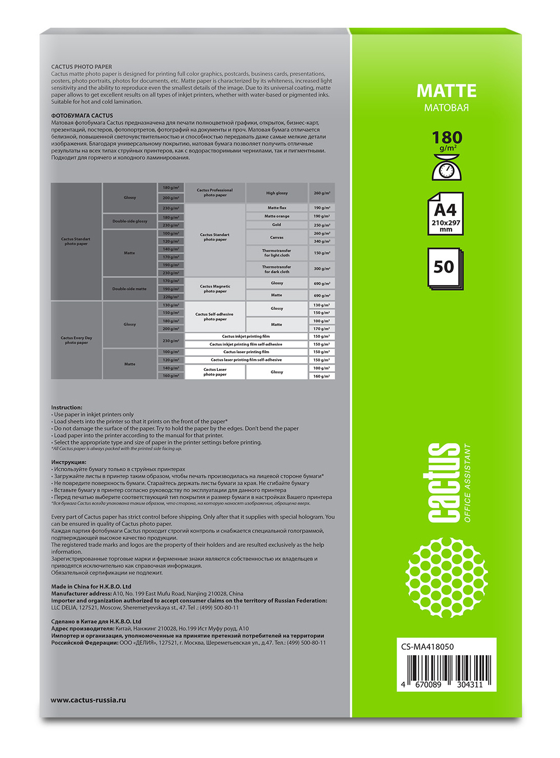 Фотобумага Cactus CS-MA418050 A4/180г/м2/50л./белый матовое для струйной печати