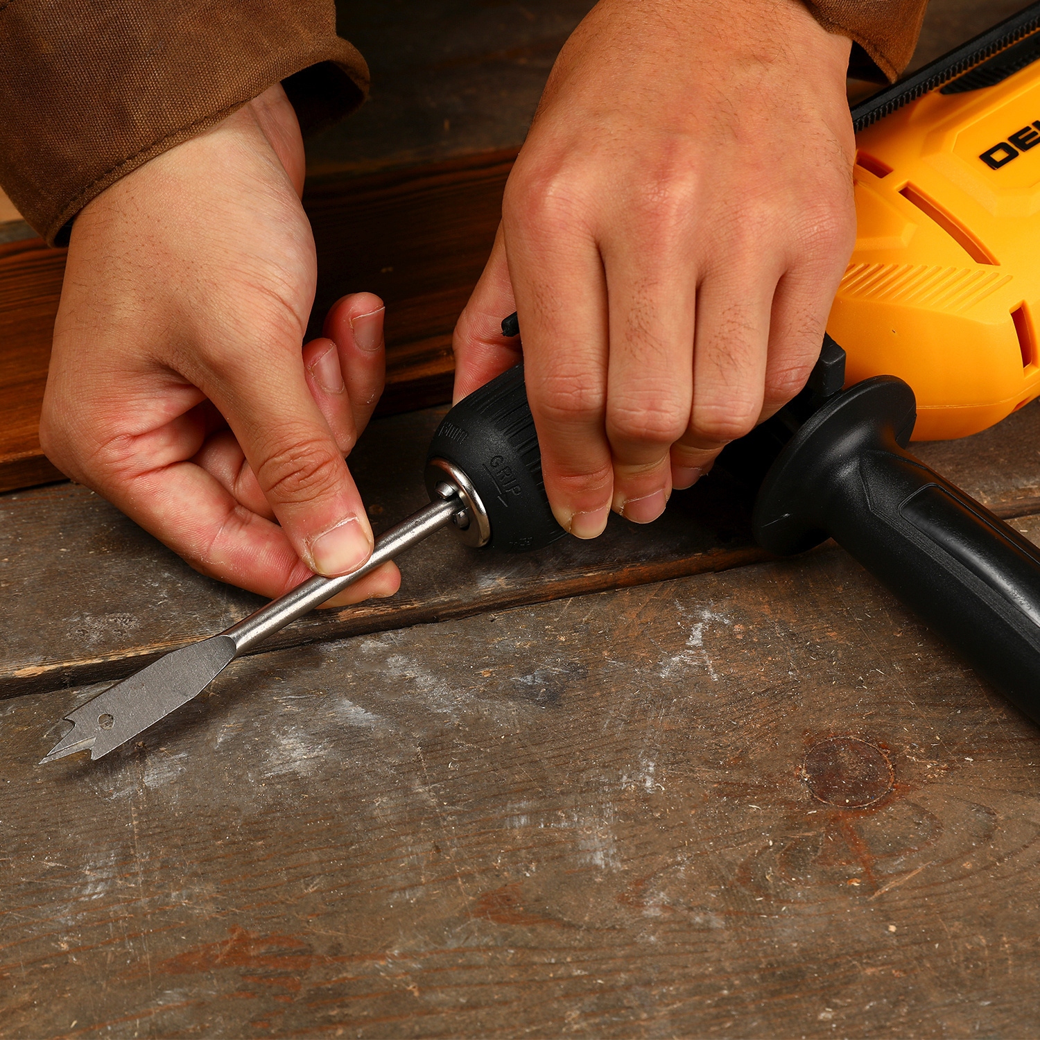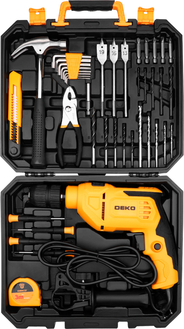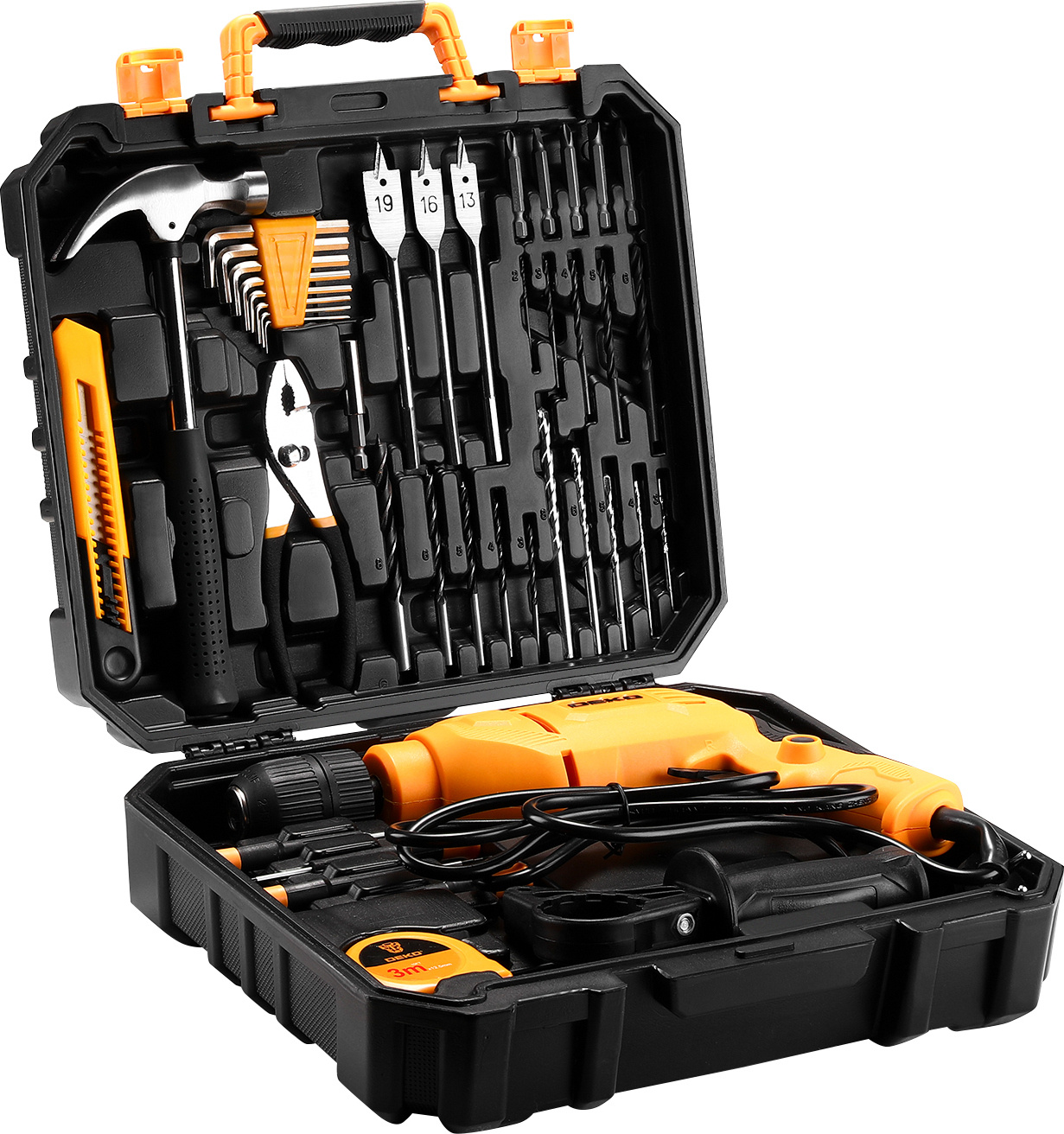 Дрель ударная, глубиномер, доп.рукоятка, строительный нож 18 мм., молоток-гвоздодер, плоскогубцы со скользящимсоединением 6", шестигранные ключи 1.5-6 мм. 8 шт., магн. держатель для бит 60 мм., сверла плоские: 13, 16, 19 мм., сверла по дереву: 3, 4, 5, 6, 8 мм., сверла по кирпич. кладке: 3, 4, 5, 6, 8 мм.