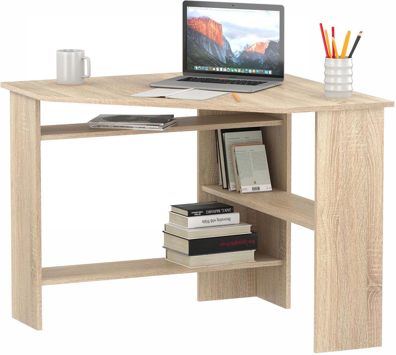 Функциональный вариант обустройства полноценной рабочей или учебной зоны. Просторная столешница разместит монитор или ноутбук, а также всё то, что необходимо держать под рукой для быстрого доступа. Несколько разноплановых полок станут удобной системой хранения книг, бумаг и прочей канцелярии.