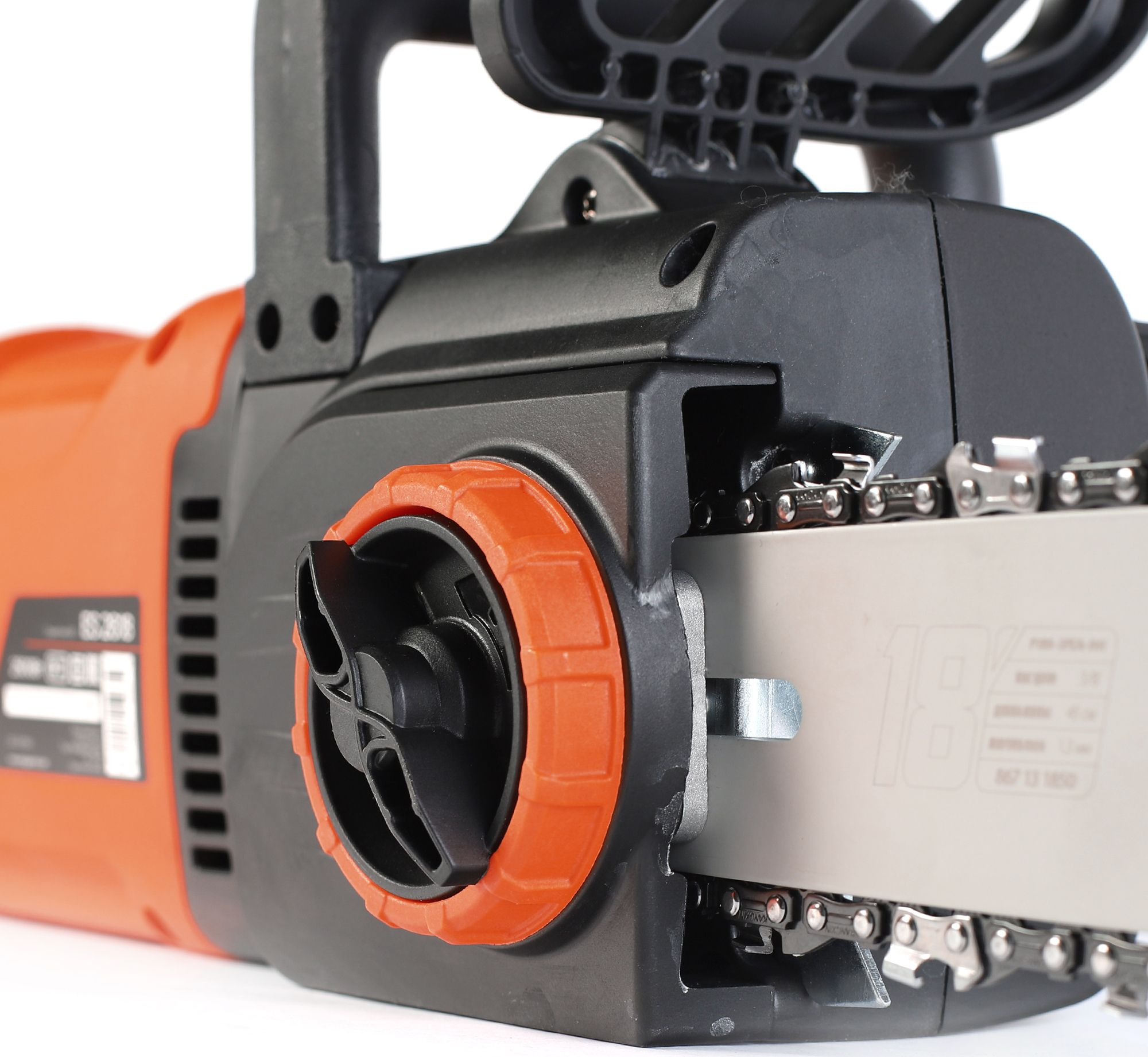 Рычаг инерционного тормоза - экстренное торможение пильной цепи в случае её отскока, предусмотрена скоба крепления сетевого кабеля