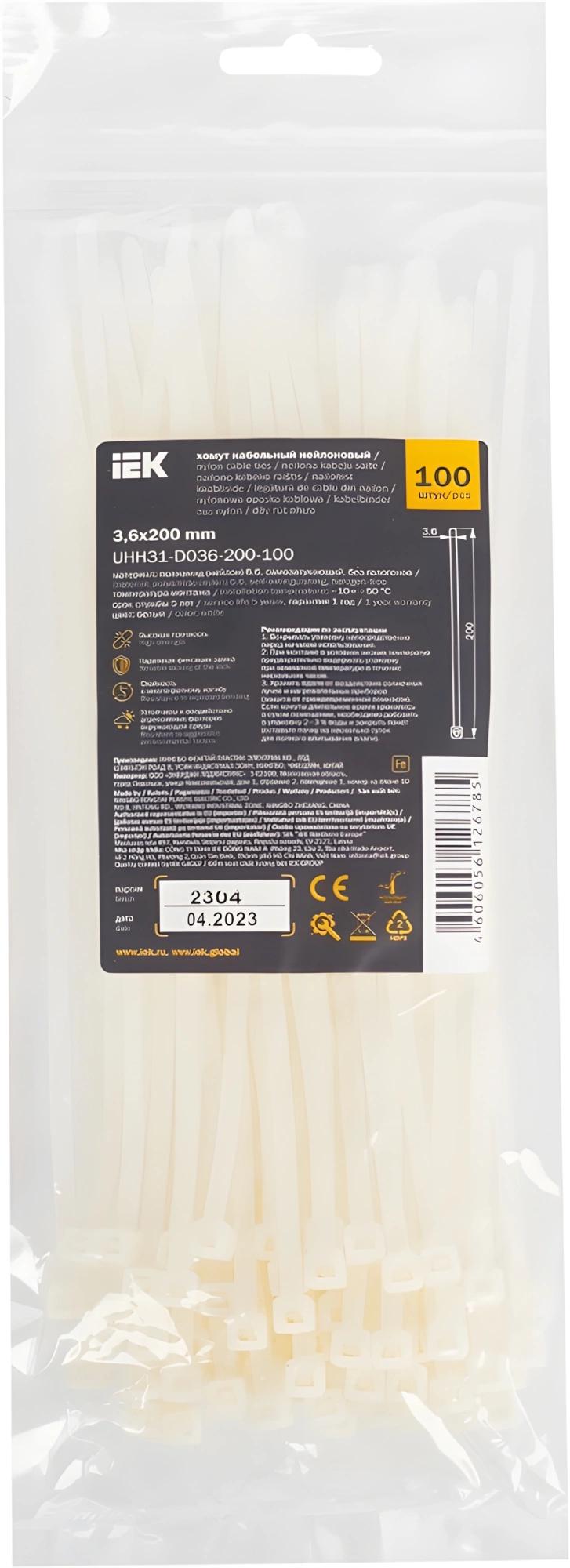 Хомут IEK UHH31-D036-200-100 200x3.6мм (упак:100шт) нейлон белый