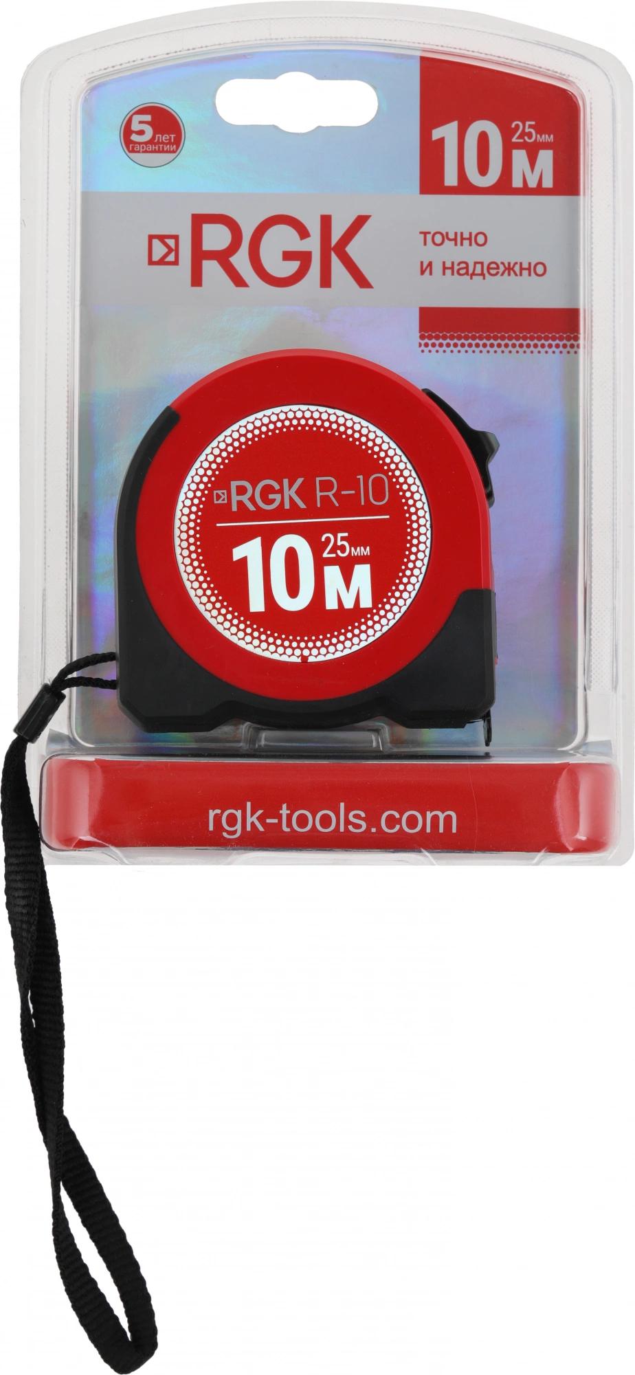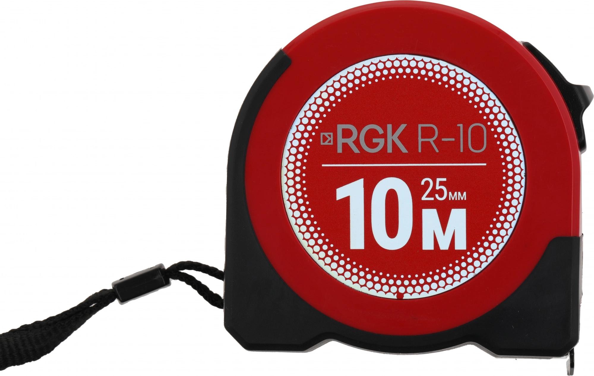 Рулетка строительная RGK R10 дл.полотна 10м изм.шкала в см зацеп простой красный/черный (774918)